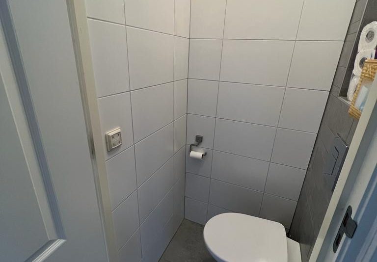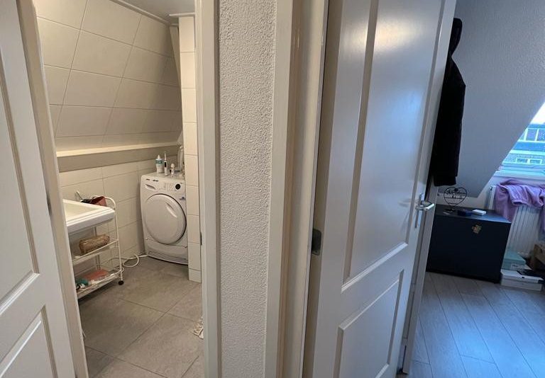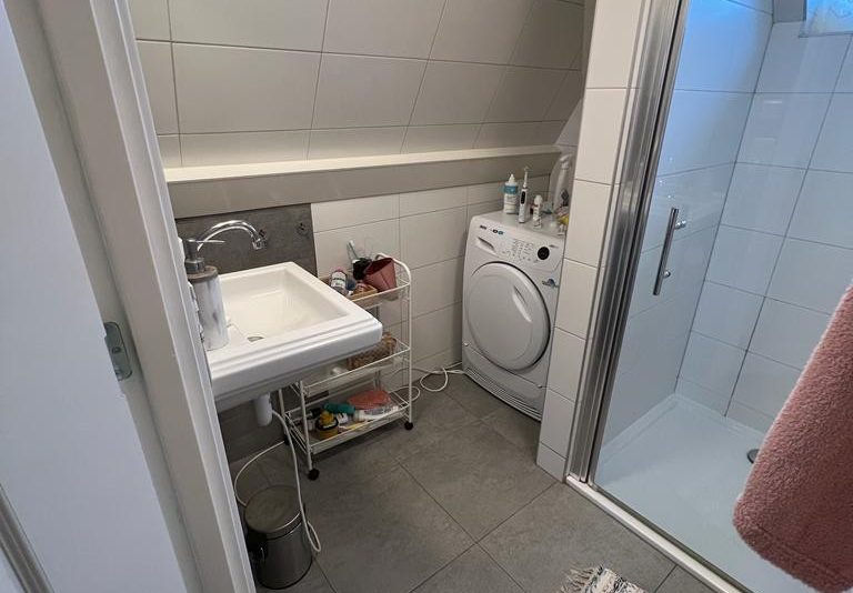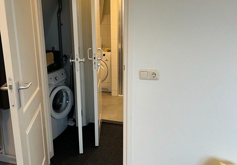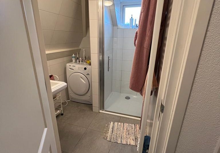 De badkamer beschikt over een aparte douche, wastafel, handdoeken radiator en aansluiting voor de wasmachine. Aan de achterkant van het appartement zit nog een aparte berging.