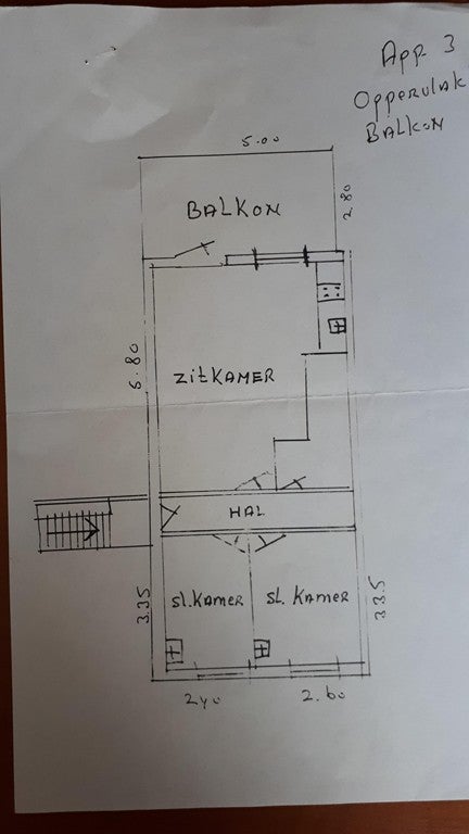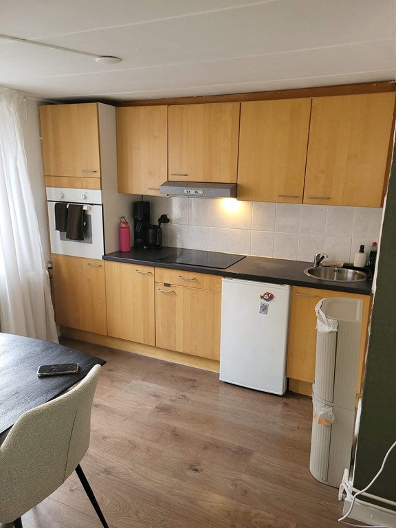 Het appartement is gesitueerd op de eerste verdieping van een kleinschalig appartmentencomplex. De woonkamer met open keuken is circa 25m2. De basis keukenopstelling is voorzien van een koelkast, oven, 4 pits elektrische kookplaat, afzuigkap en spoelbak. De woning beschikt over 2 compacte slaapkamers van respectievelijk 9m2 en 8m2.
