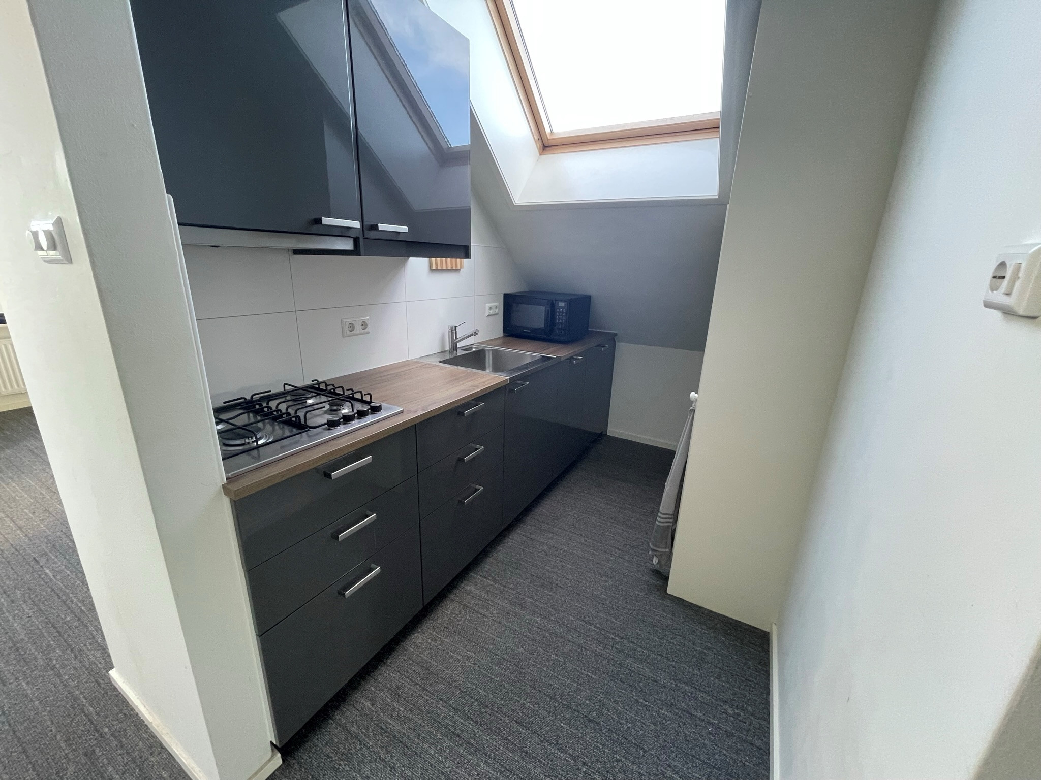 De keuken is voorzien van een vaatwasser (lady-model), gaskookplaat en afzuigkap. De keuken is uitgevoerd in een fraai grijze kleurstelling en afgewerkt met een houten blad. De badkamer is eveneens keurig qua afwerking en voorzien van een wasmachine-aansluiting, douchegelegenheid en een wastafel. Er zit een eigen berging bij het appartement.
