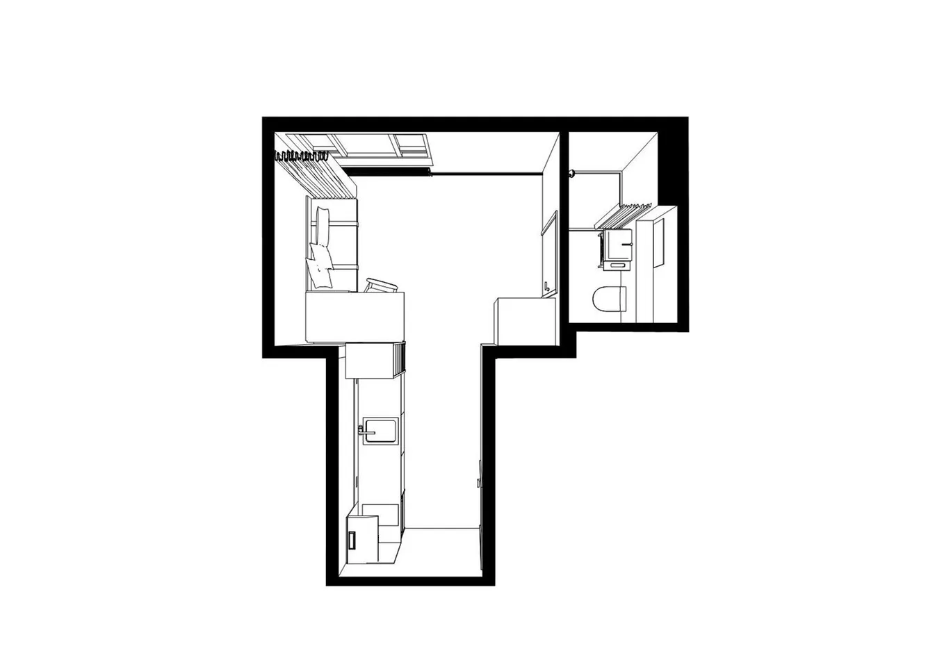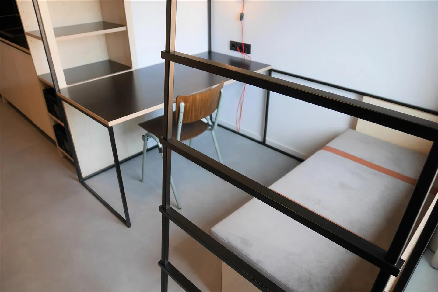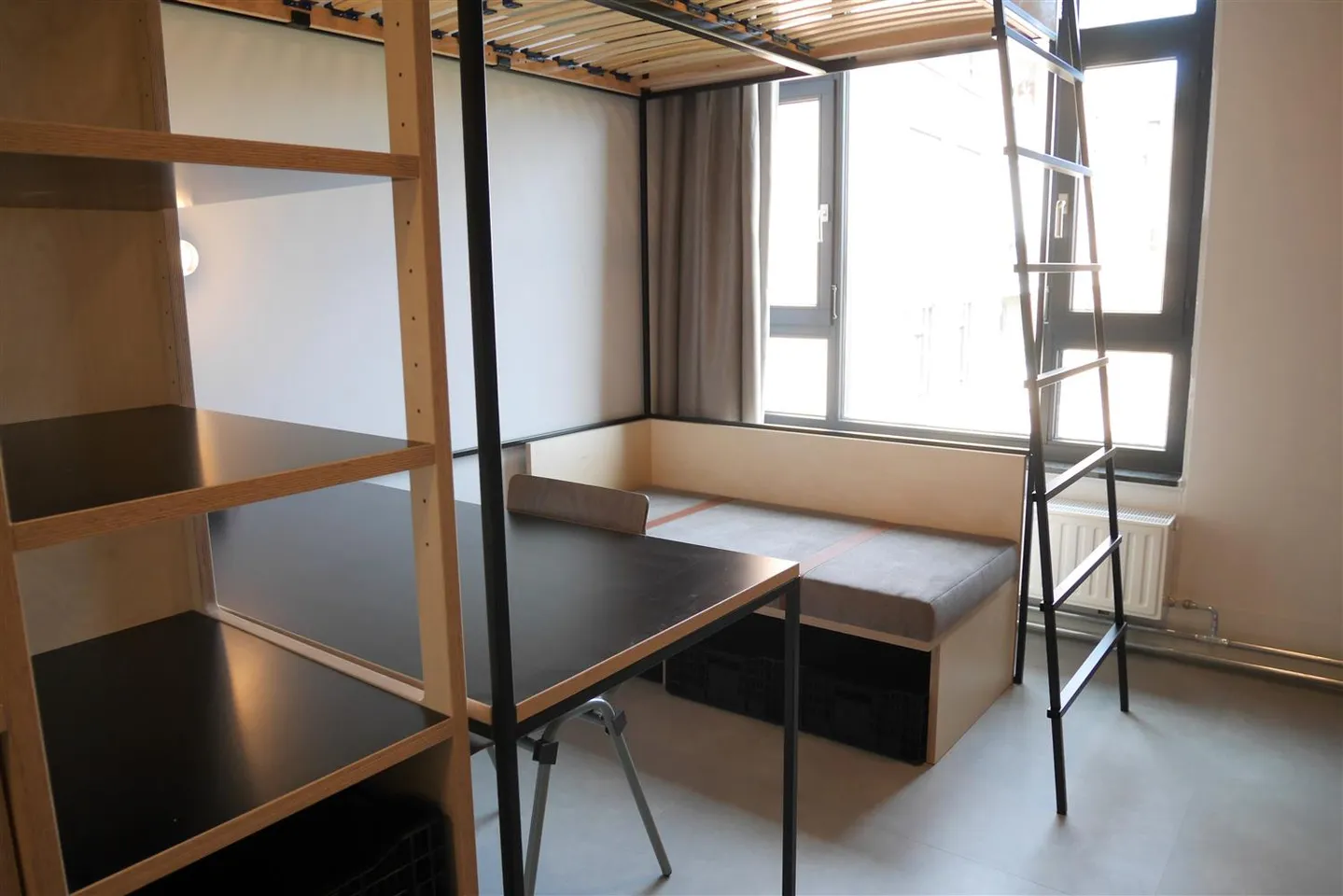 The studio is furnished with a double bed (), modern en-suite bathroom, luxurious open kitchen (incl. built-in appliances), large clothing & storage cupboard, desk with chair, lounge sofa and high-speed internet. The studio is located on the fourth floor (north side), with a view over the courtyard. See the floor plan for the units location in the building.