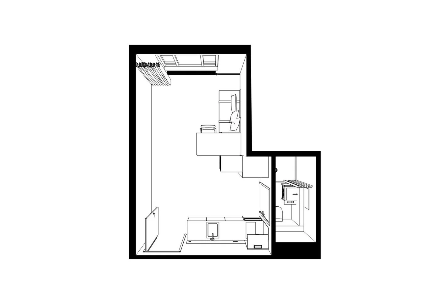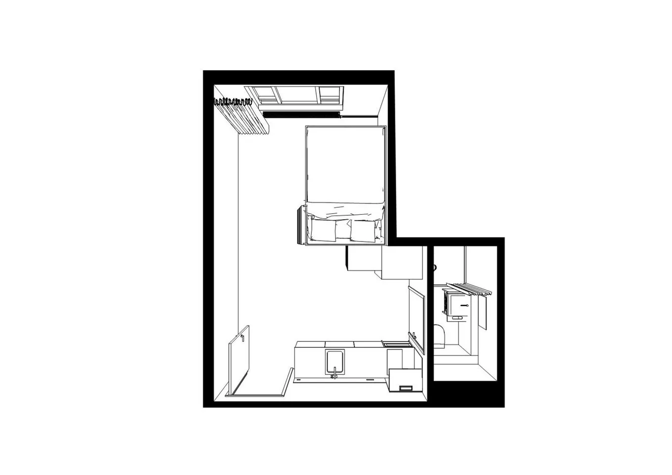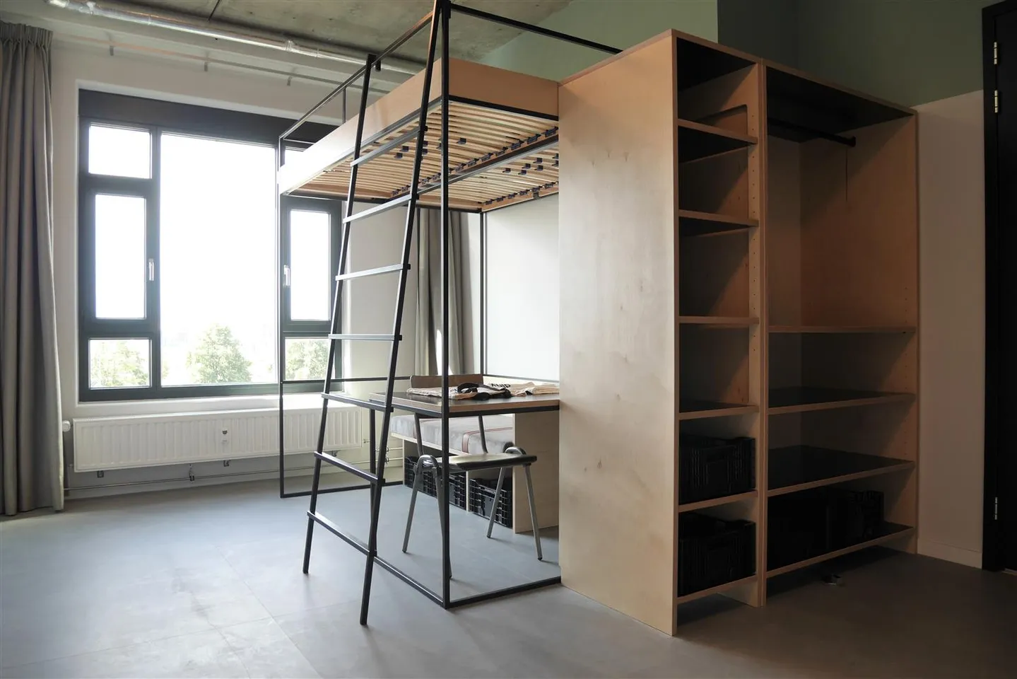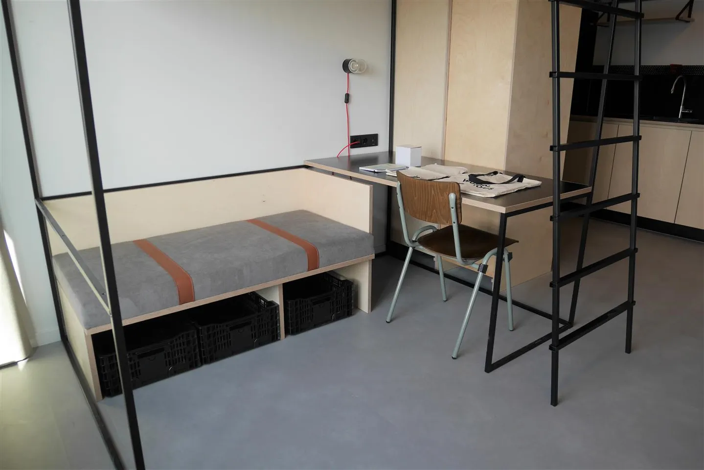 The studio is furnished with a double bed (), modern en-suite bathroom, luxurious open kitchen (incl. built-in appliances), large clothing & storage cupboard, desk with chair, lounge sofa and high-speed internet. The studio is located on the fourth floor (north side), with a view over the courtyard. See the floor plan for the units location in the building.