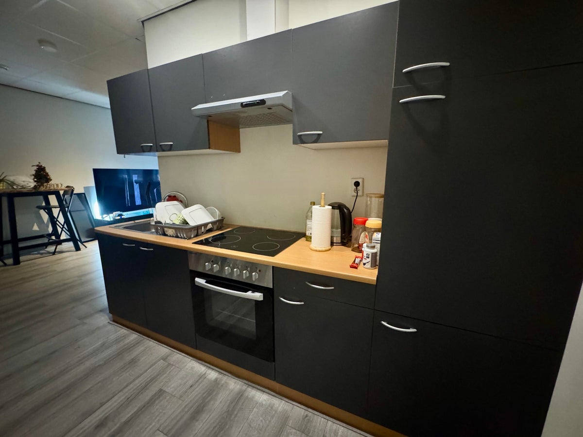 Het appartement bevindt zich op de eerste verdieping van het pand. Je komt binnen in de halfopen keuken, die is voorzien van een inductiekookplaat, afzuigkap, koelkast met vriesvak en oven.