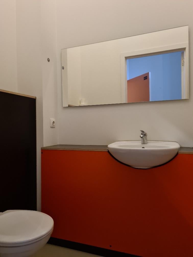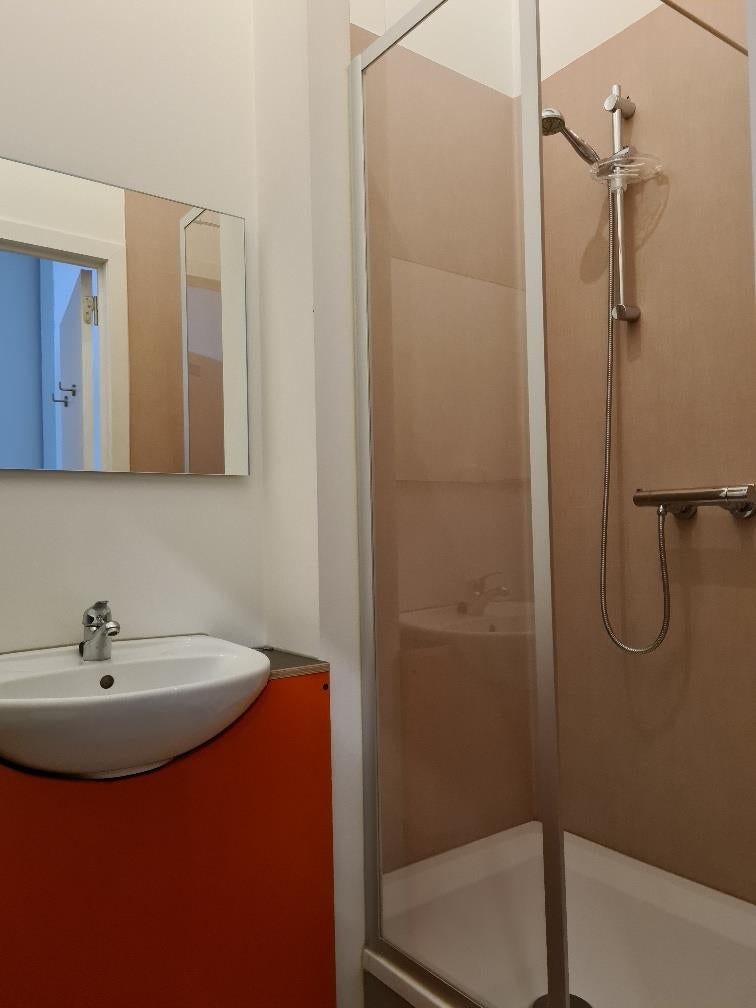 De moderne badkamer is uitgerust met een douche, toilet en wastafel. Daarnaast beschikt de studio over een comfortabele hoogslaper met matras en een handig bureau.