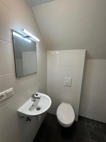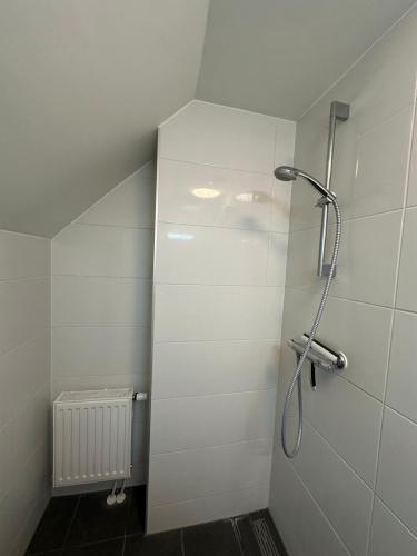 De badkamer is modern afgewerkt en voorzien van een douche, wastafel en toilet. Het geheel oogt fris en goed onderhouden.