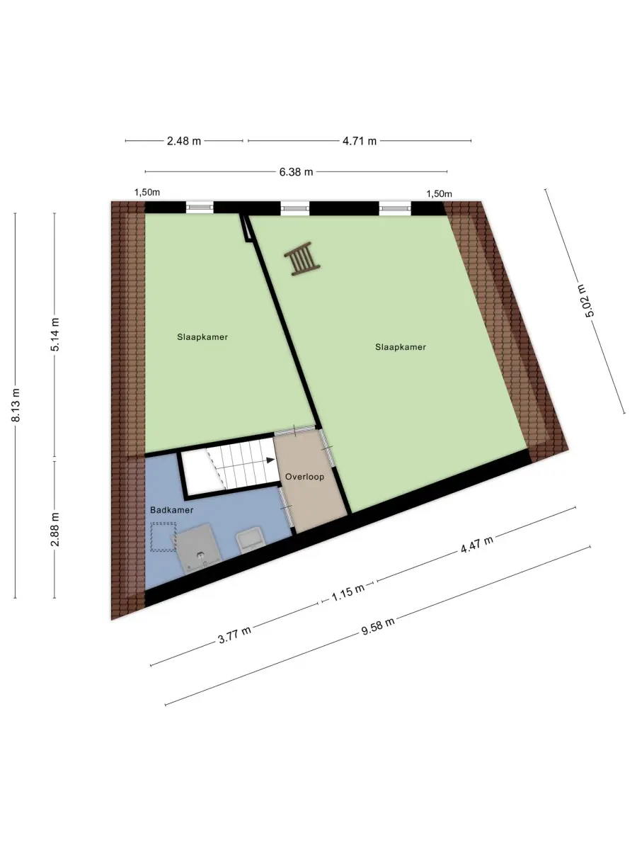 Boven bevinden zich een overloop en twee slaapkamers van respectievelijk (ca.20,5 m2 ) en (ca.
