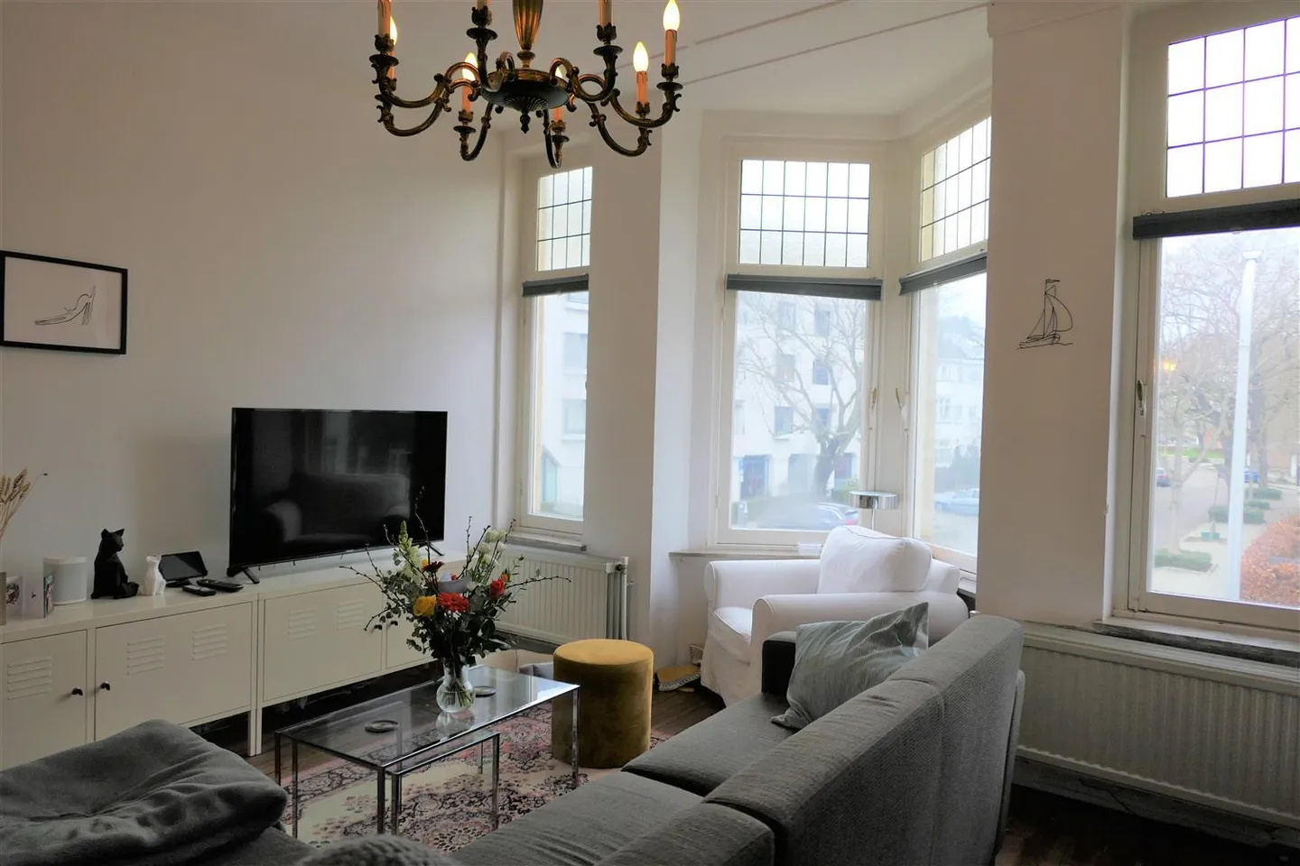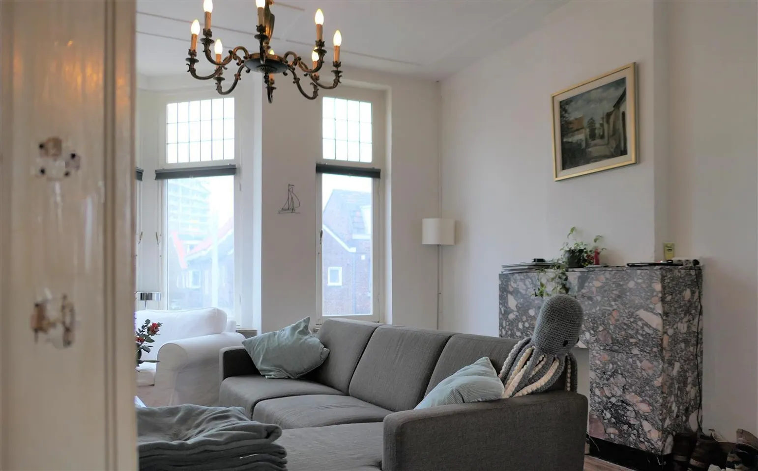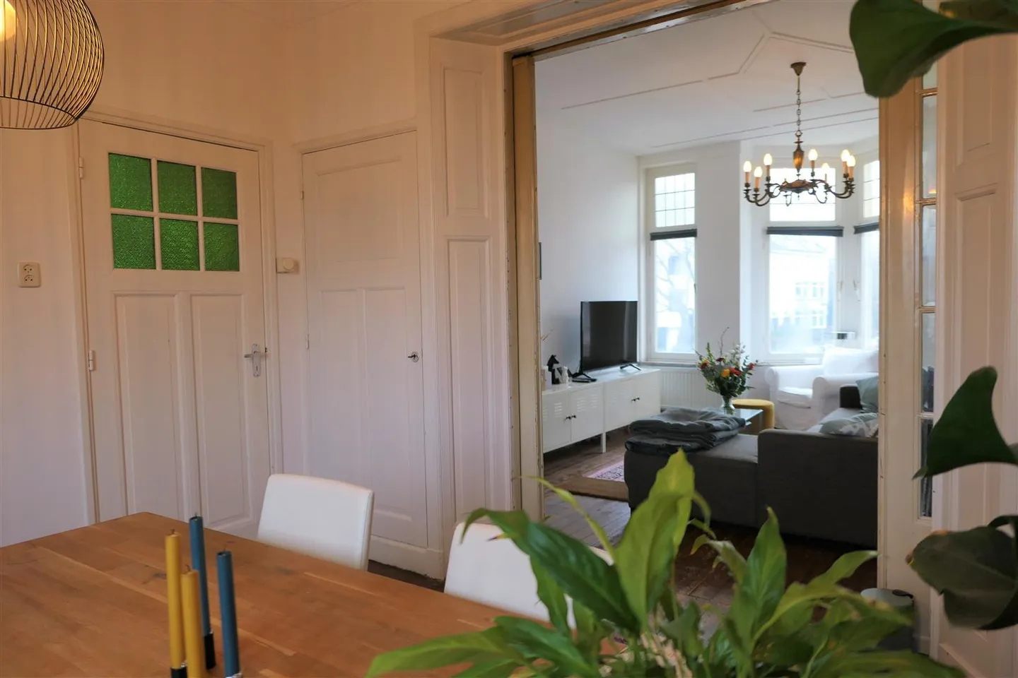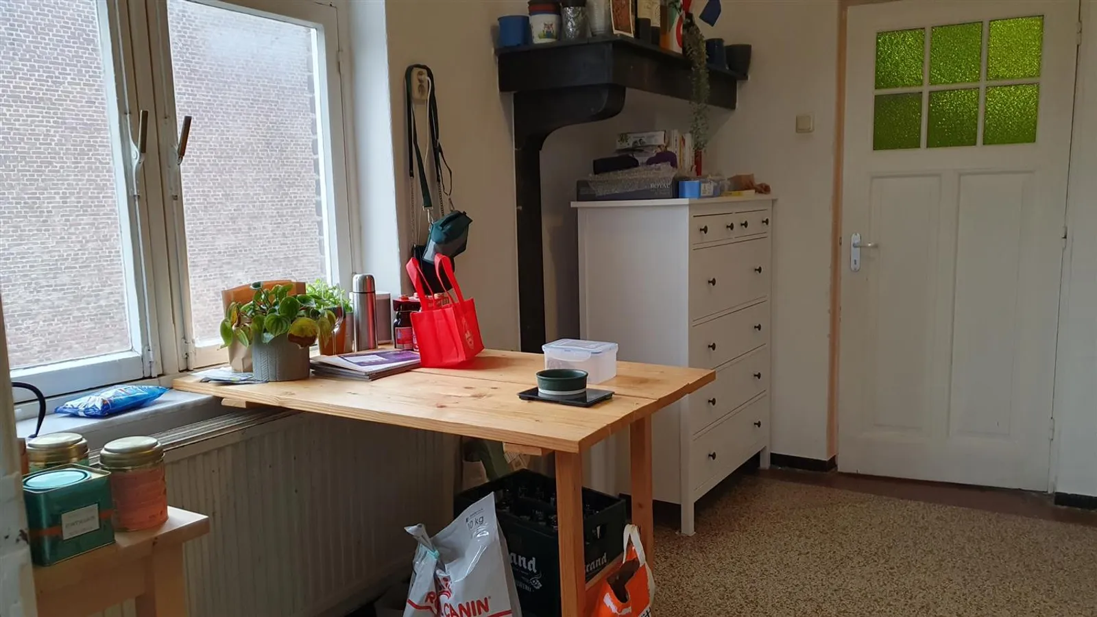 Charming 1930s upstairs apartment with authentic elements such as stained glass windows.