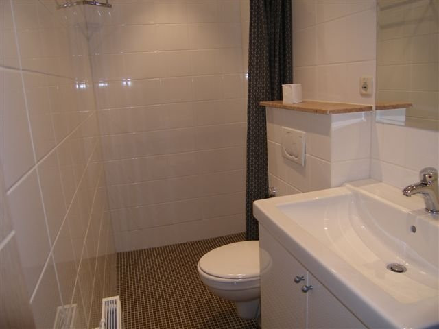 Moderne badkamer . douche, toilet, en wastafel. Het gehele object is . laminaatvloer.