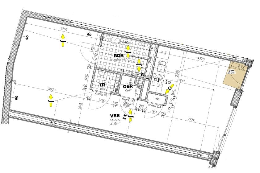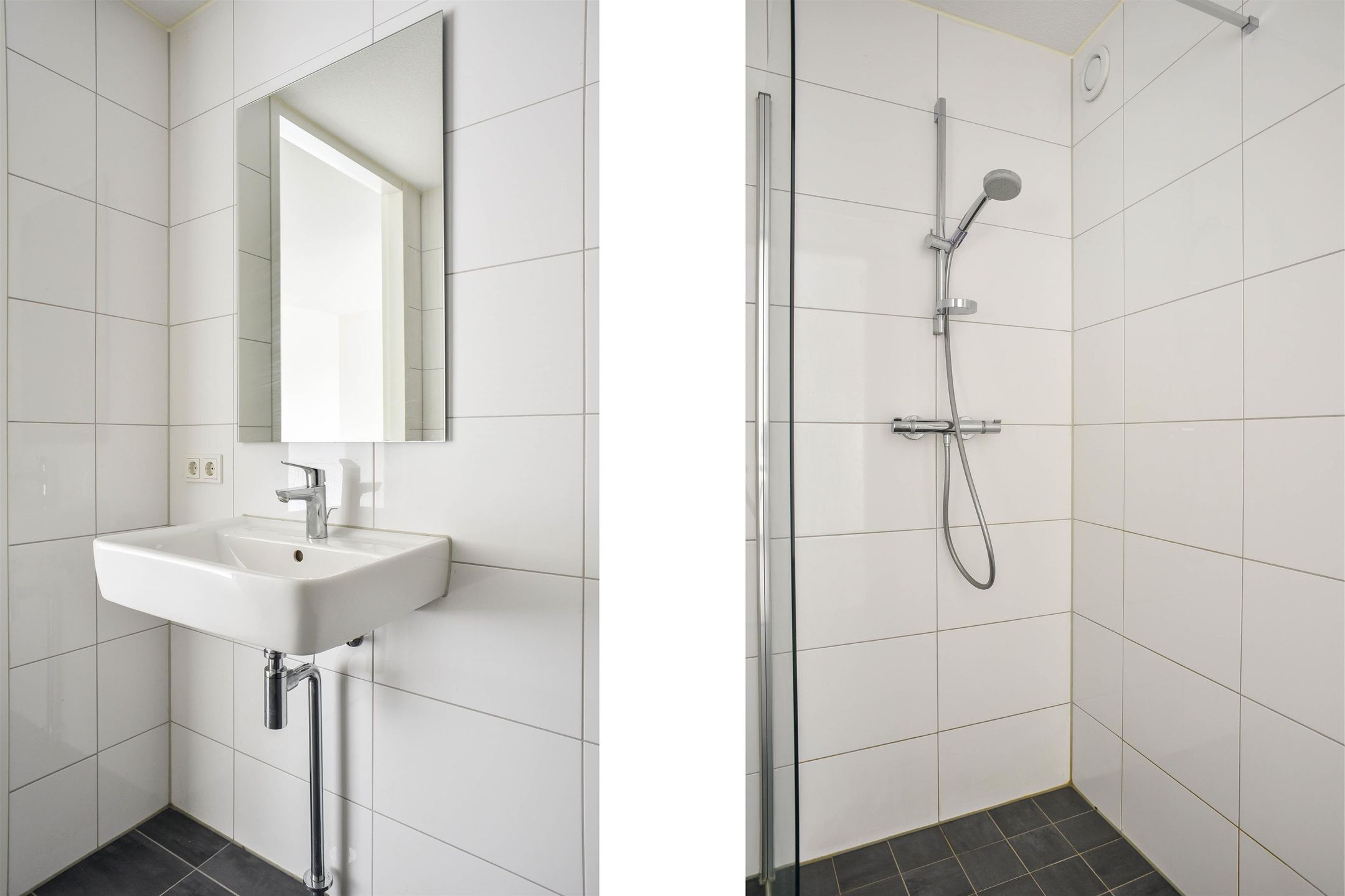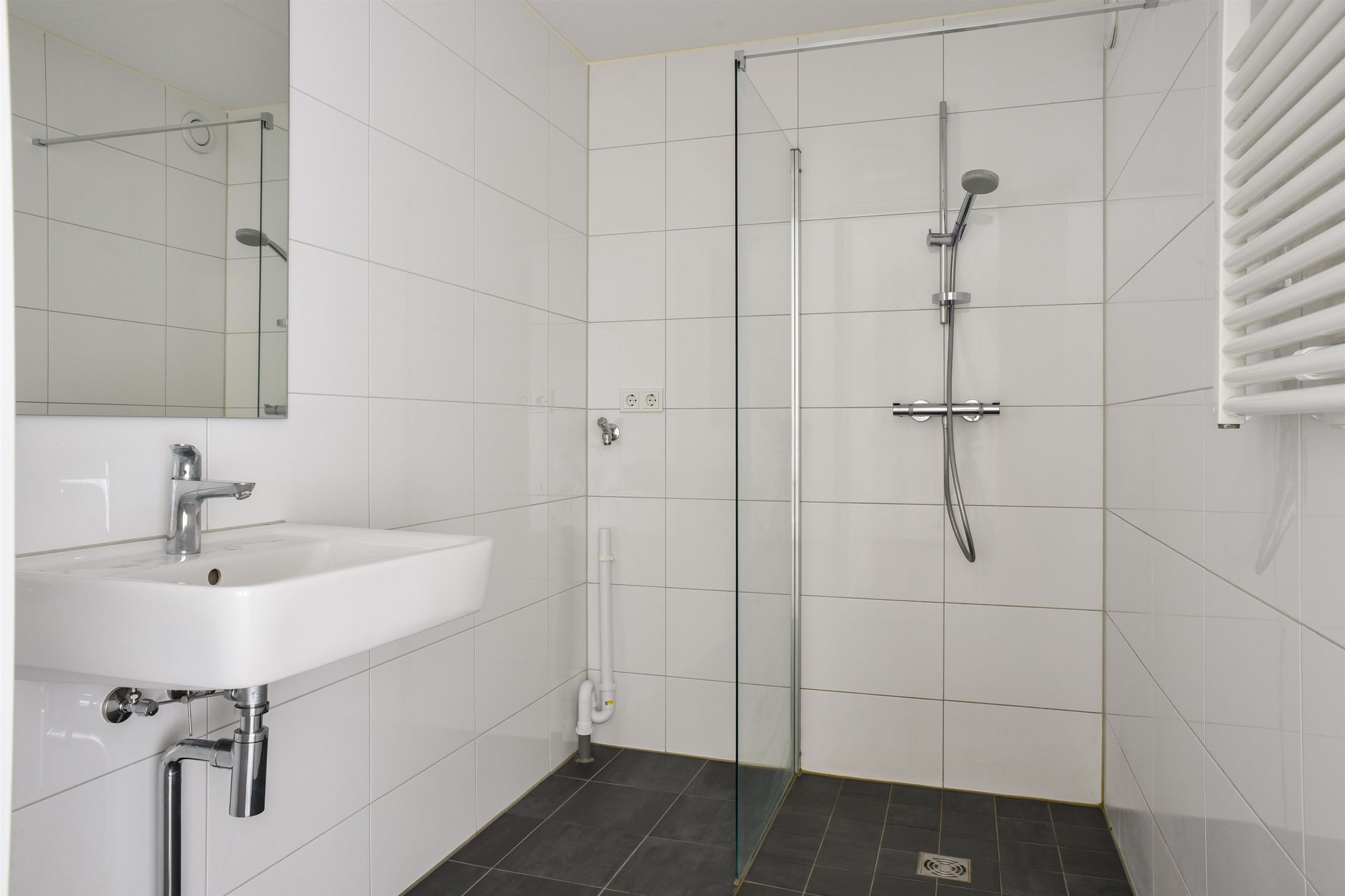 De badkamer is ingericht met een douche, wastafel, handdoekenradiator en een wasmachineaansluiting. Voor extra gemak is er een apart toilet voorzien van een fonteintje. Hoewel er geen balkon of berging aanwezig is, biedt de studio alles wat je nodig hebt voor comfortabel wonen.
