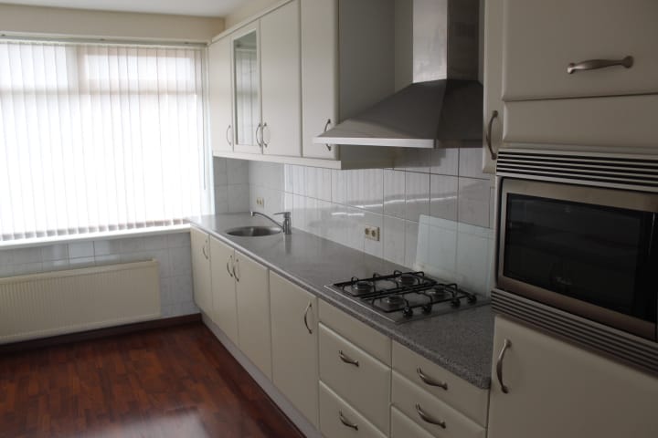 Open keuken in wandopstelling, met ingebouwde afzuigkap, gaskookplaat, koelkast en magnetron. Tevens zijn in de keuken de aansluitingen voor de wasapparatuur gesitueerd.
