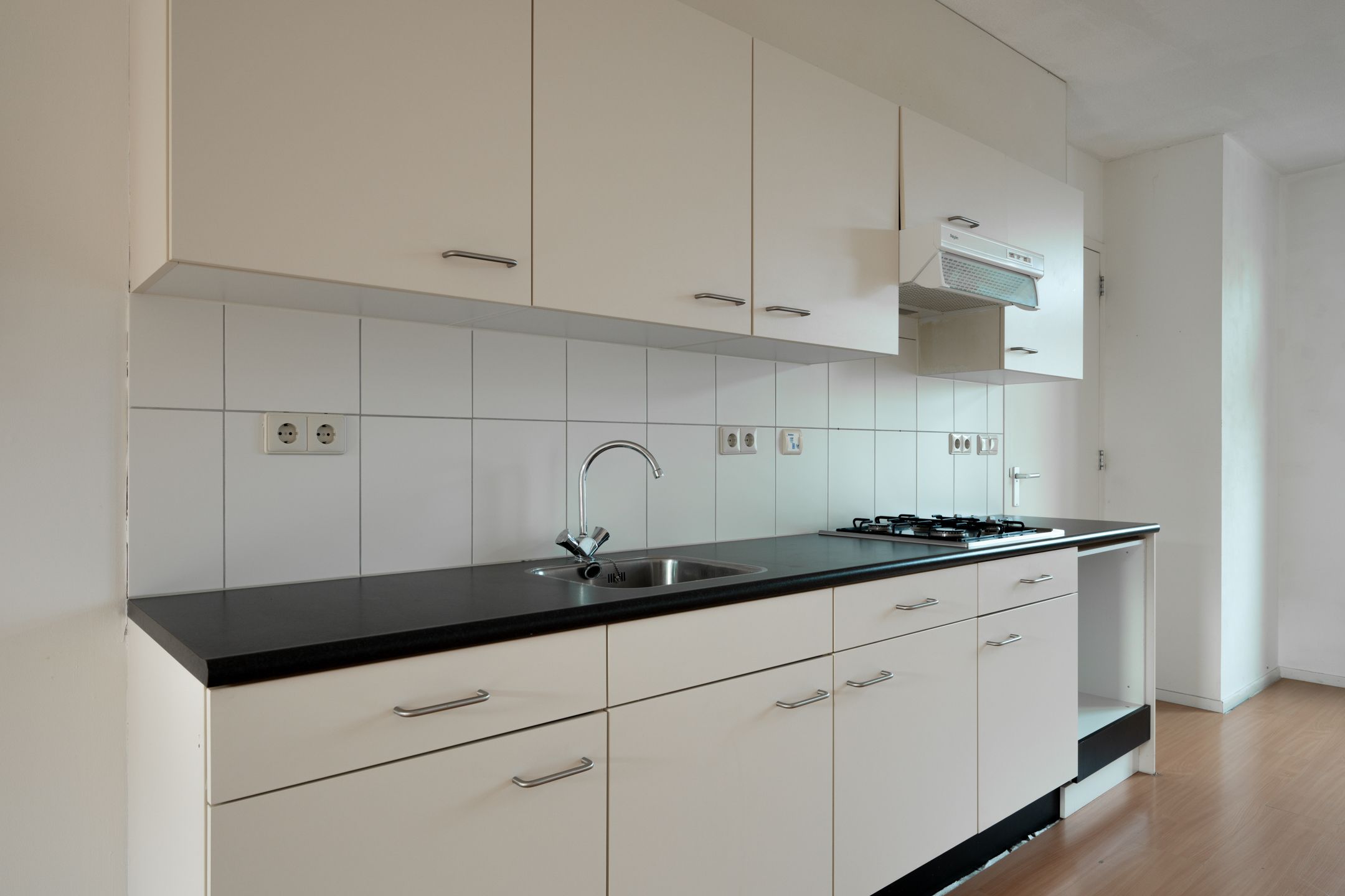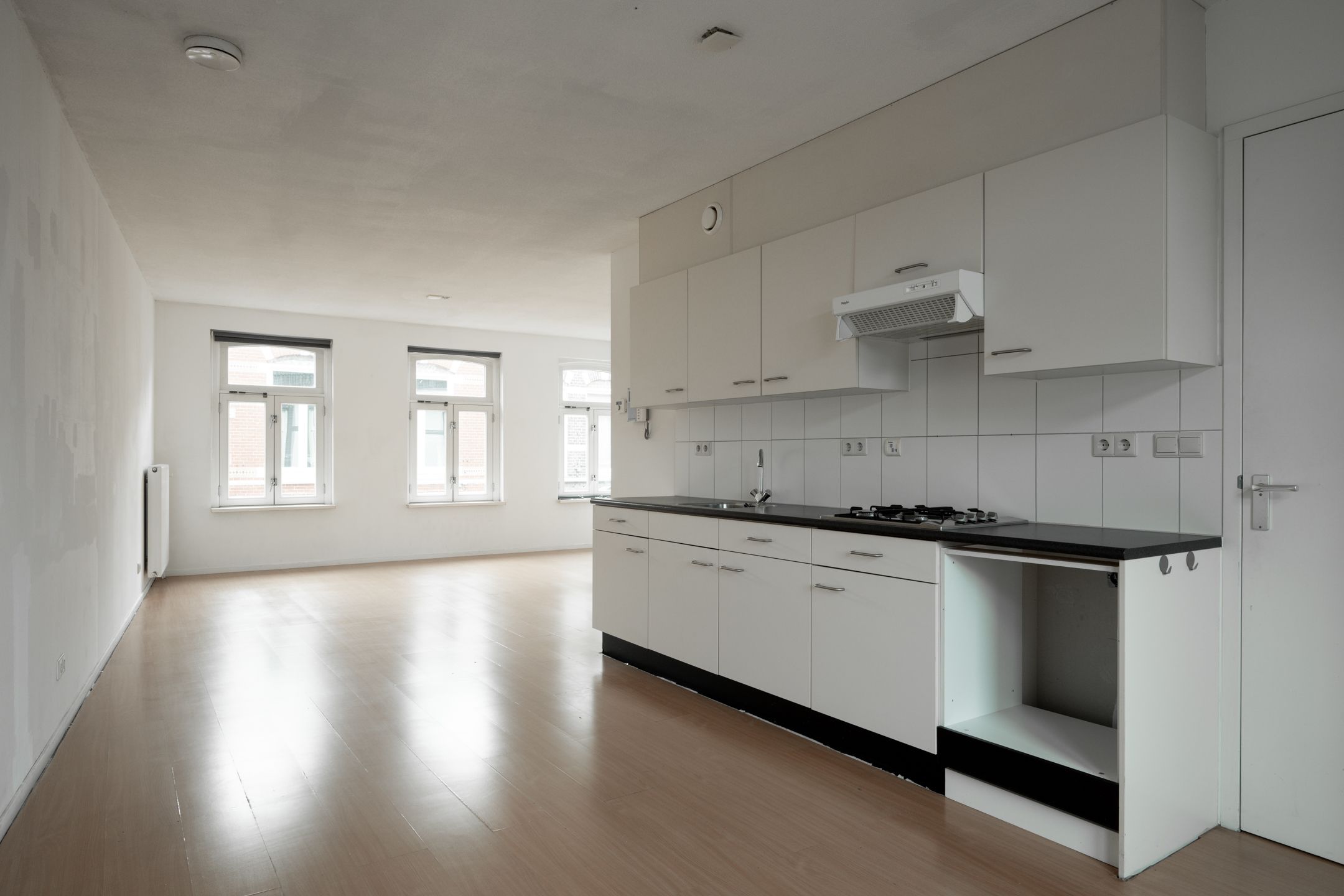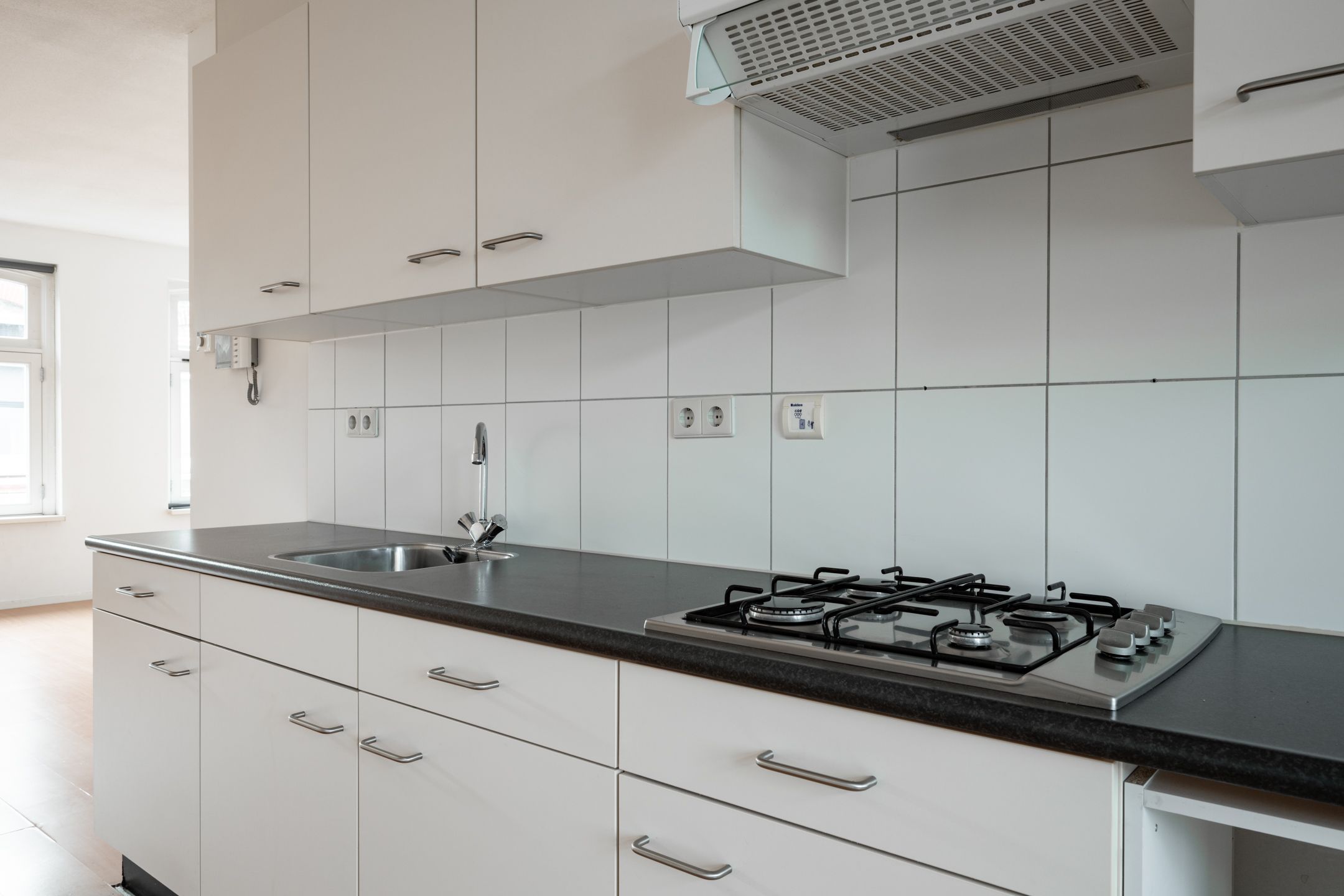 De keuken is uitgerust met een gasfornuis, afzuigkap en spoelbak en biedt directe toegang tot het terras. Vanuit de keuken kom je in de ruime en lichte woonkamer, die voldoende ruimte biedt voor zowel een eethoek als een comfortabele zithoek.
