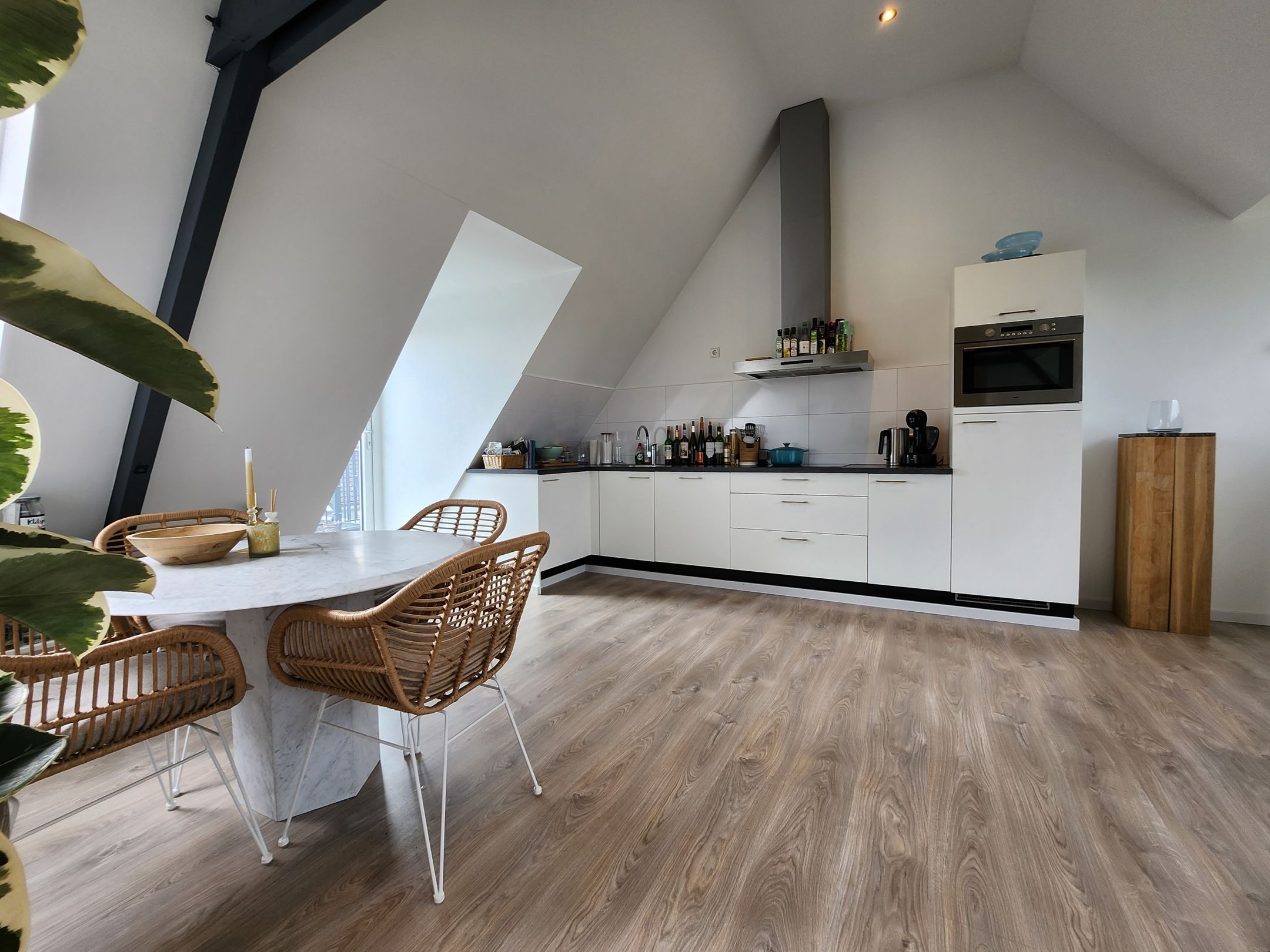 De woonkamer met open keuken beschikt over grote dakkapel aan de voorzijde, die bijna over de hele breedte van de woonkamer gaat. De woonkamer is . voorzien van een nette laminaatvloer en diverse opbouw- en inbouwspots.