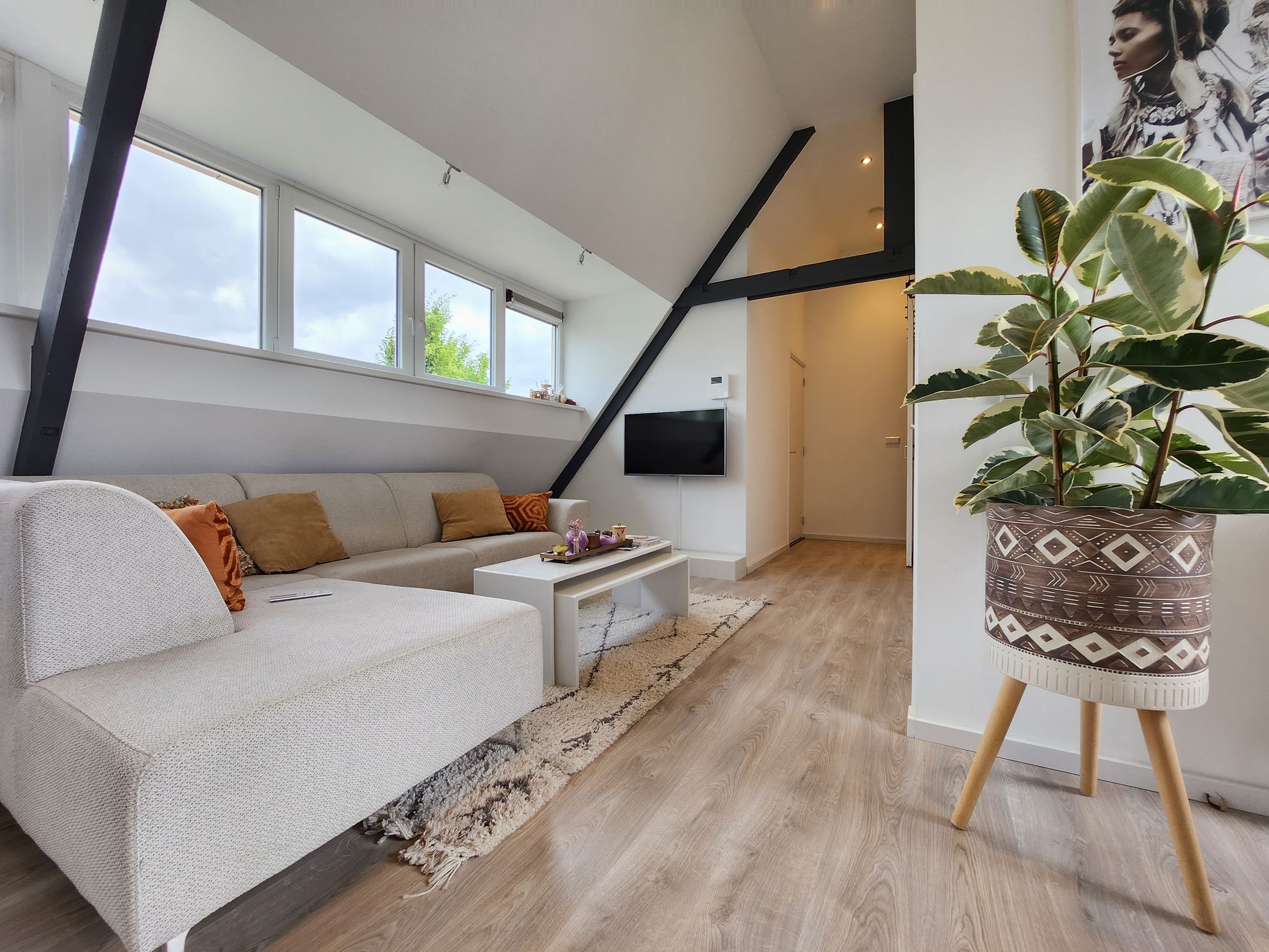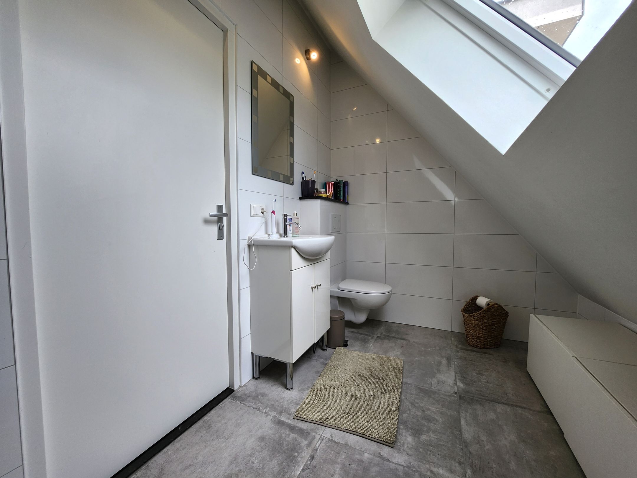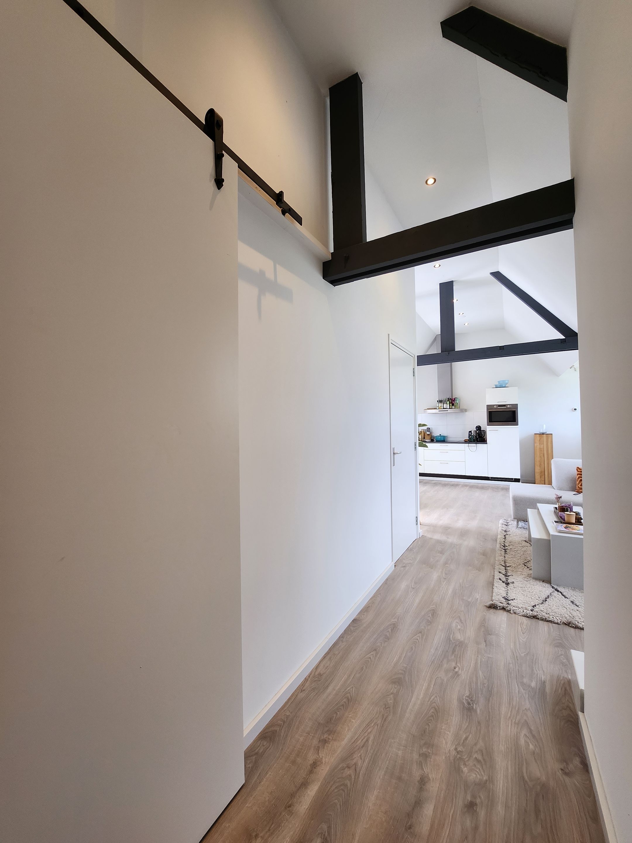 Na het openen van de barn-schuifdeur vervolg je de weg in het appartement en springt meteen de mooie houten kapconstructie in het oog. Vervolgens tref je de moderne badkamer aan, welke is voorzien van een luxe wastafelmeubel en spiegel, douchecabine met regendouche en een hangend closet.