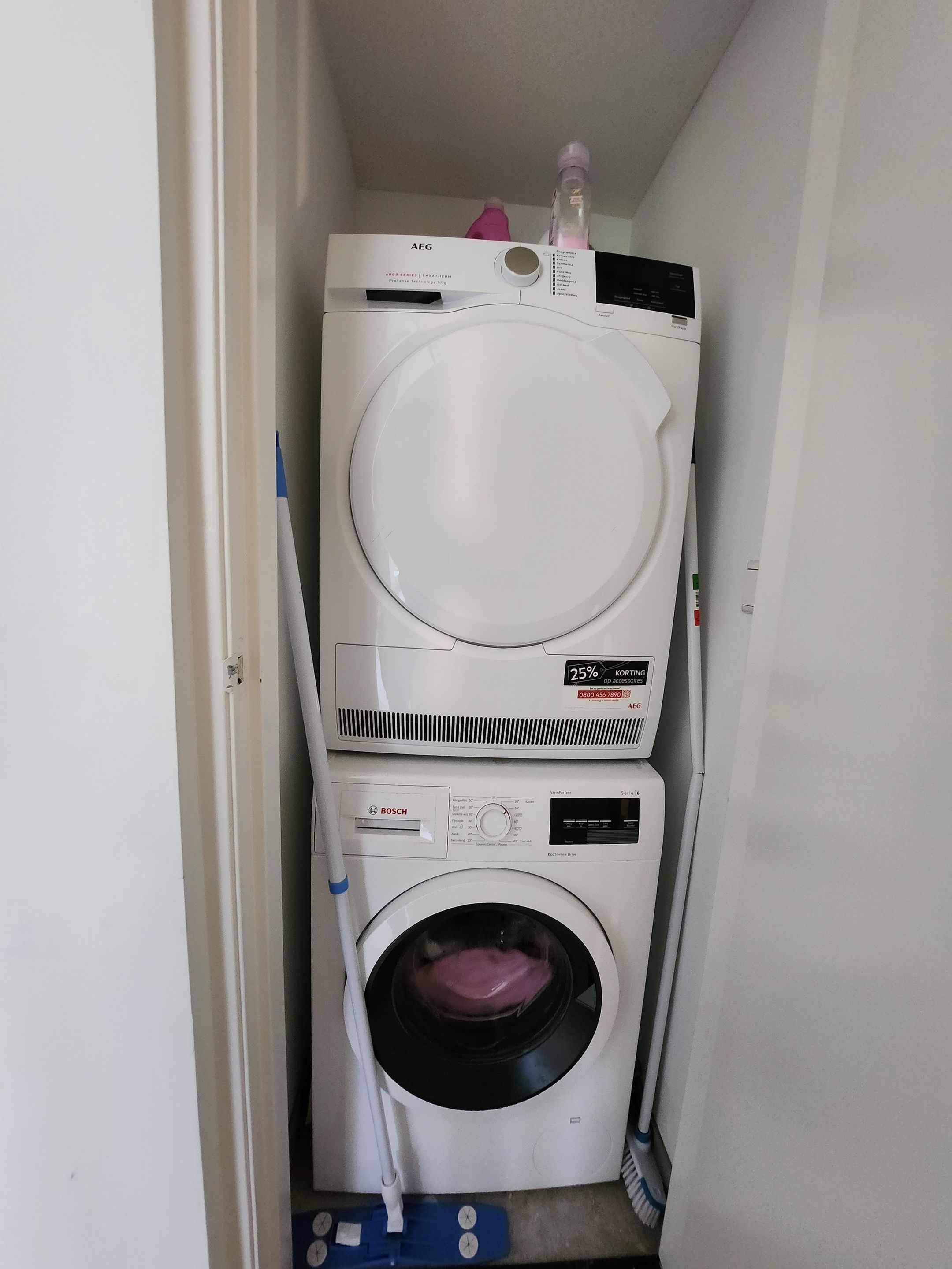 Op de overloop is aan je rechterhand de wasruimte gelegen, waar wasmachine en droger bovenop elkaar geplaatst kunnen worden.