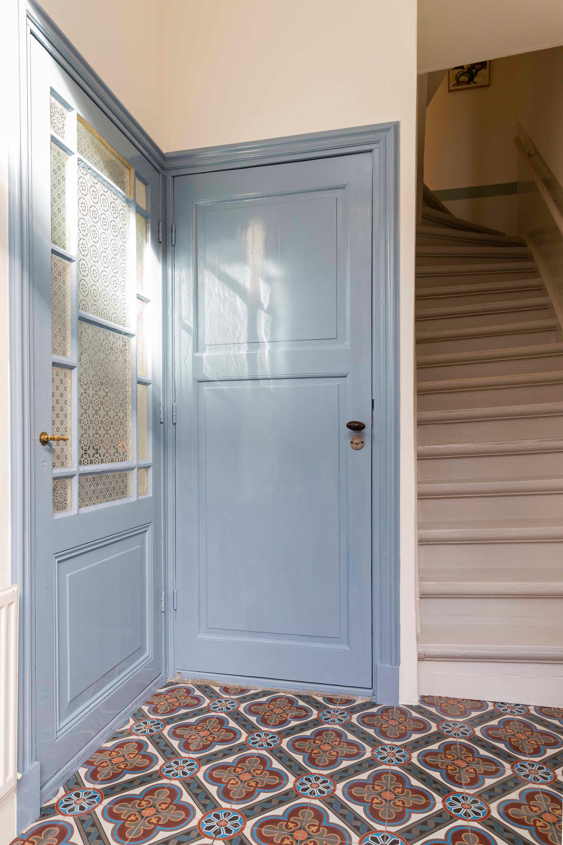 -FIRST FLOOR: Two bedrooms, bathroom, and access to the sunny roof terrace.