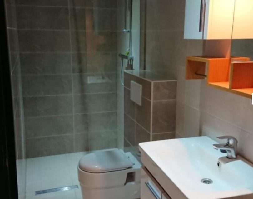 De badkamer is volledig betegeld en is nieuw.