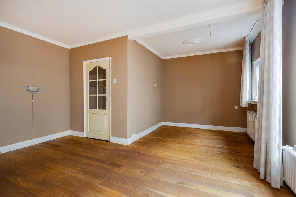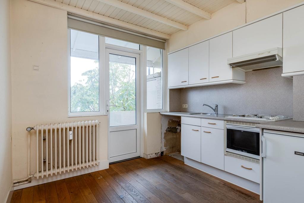 Via de hal is toegang tot alle vertrekken. De lichte woonkamer aan de voorzijde is circa 25 m² groot en afgewerkt met een houten vloer. De gesloten keuken is voorzien van een 4-pits gasfornuis, afzuigkap, oven en koelkast.