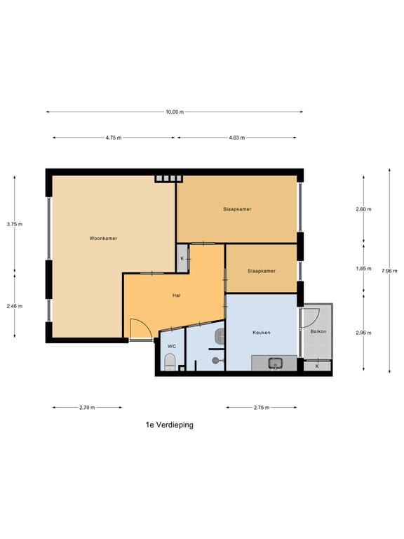 Vanuit de keuken is er toegang tot het balkon aan de achterzijde van circa 2 m². De badkamer beschikt over een douchecabine en wastafel. Daarnaast is er een separate toiletruimte. Het appartement telt twee slaapkamers: