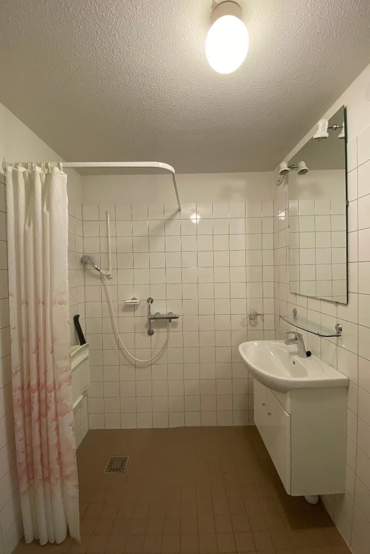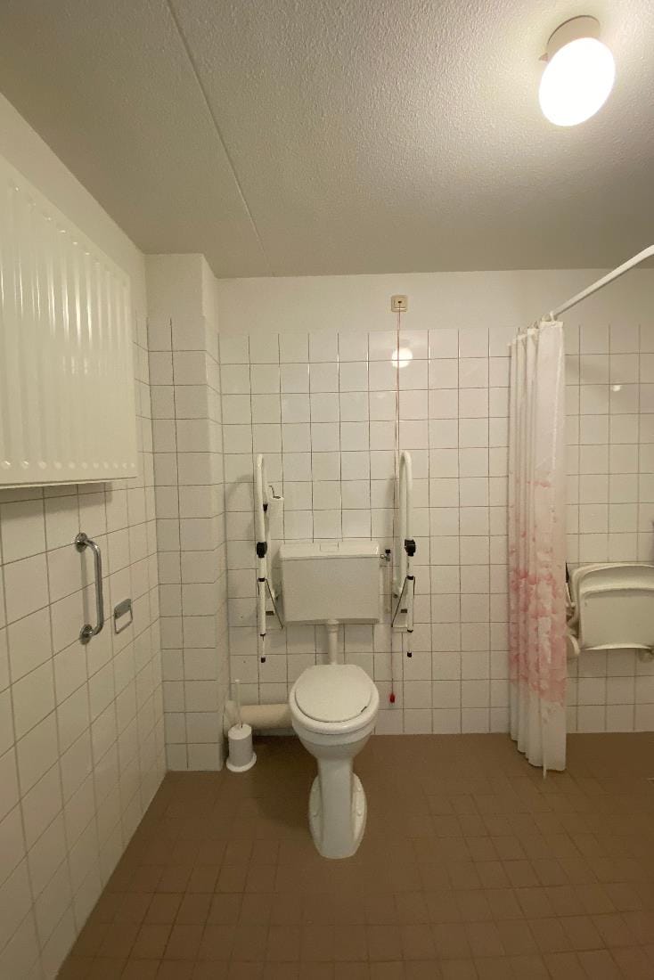 Bij binnenkomst vindt u een hal met stookruimte en wasmachineaansluiting, een ruime badkamer met douche en douchestoel, toilet met steunen, en een wastafel met spiegel en planchet.