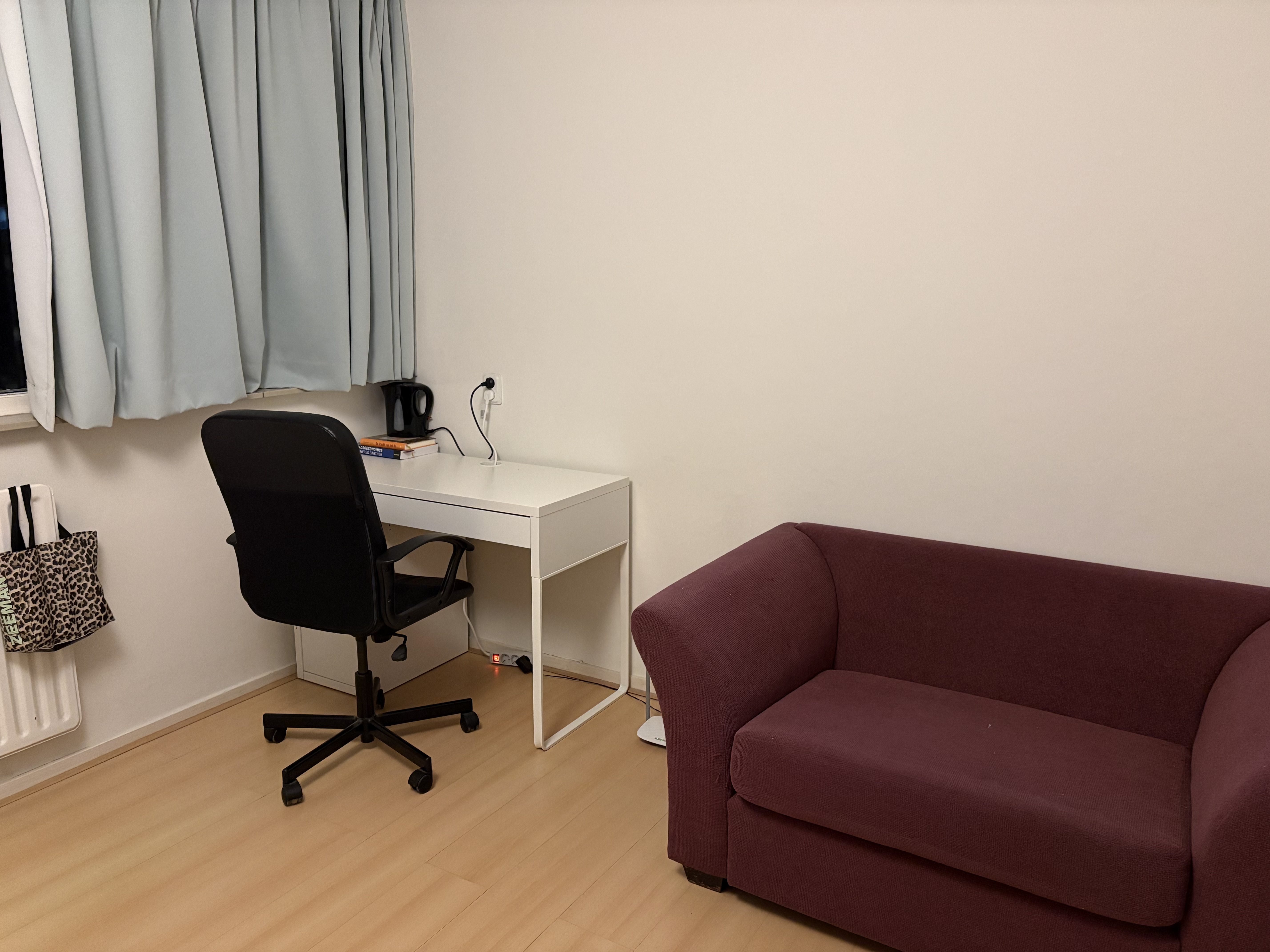 Vloer inbegrepen. Het bureau + stoel zijn ook beschikbaar als je die wilt overnemen.