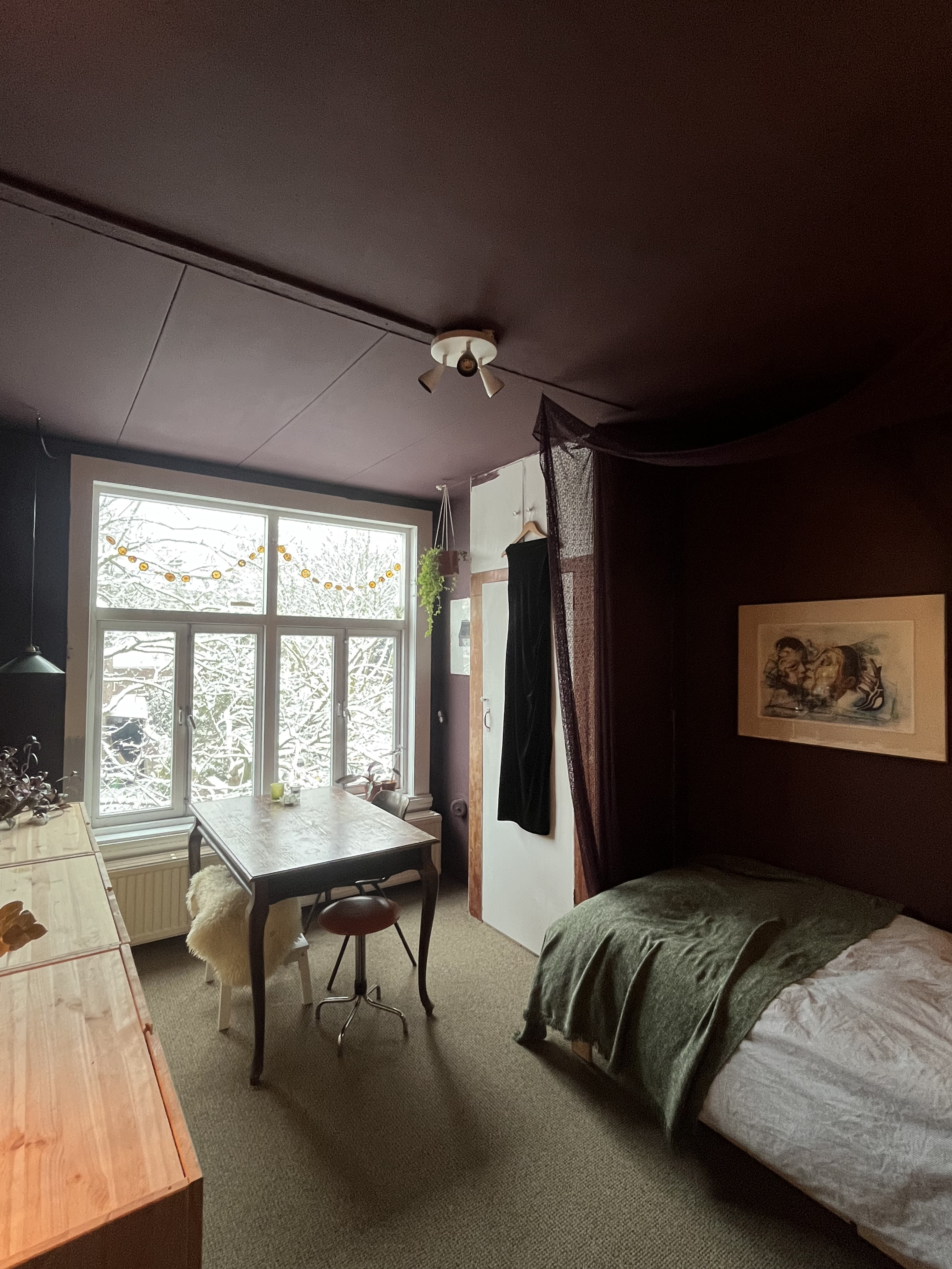 De betreffende kamer is gesitueerd op de eerste etage aan de achterzijde van het pand en is circa 12 m2 groot. De keuken, douche en toilet worden gedeeld met de drie medebewoners.