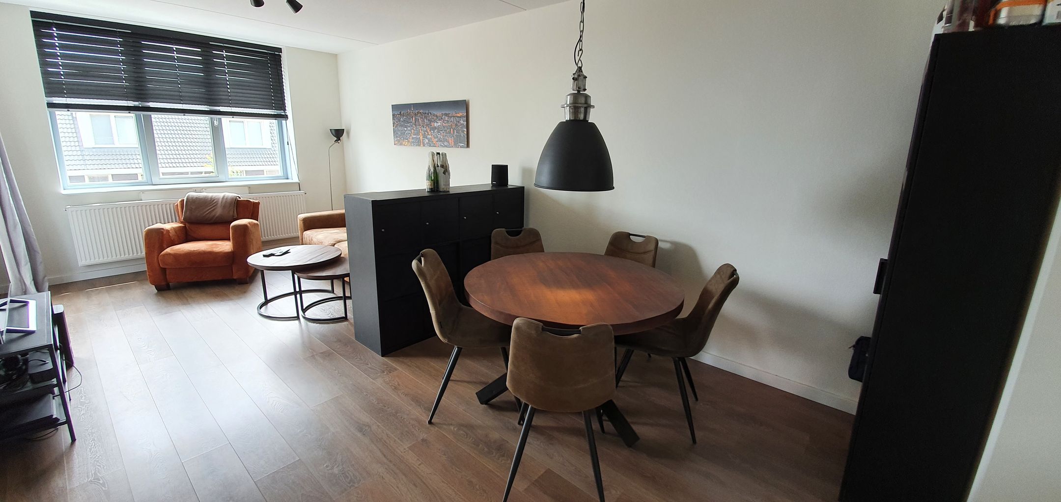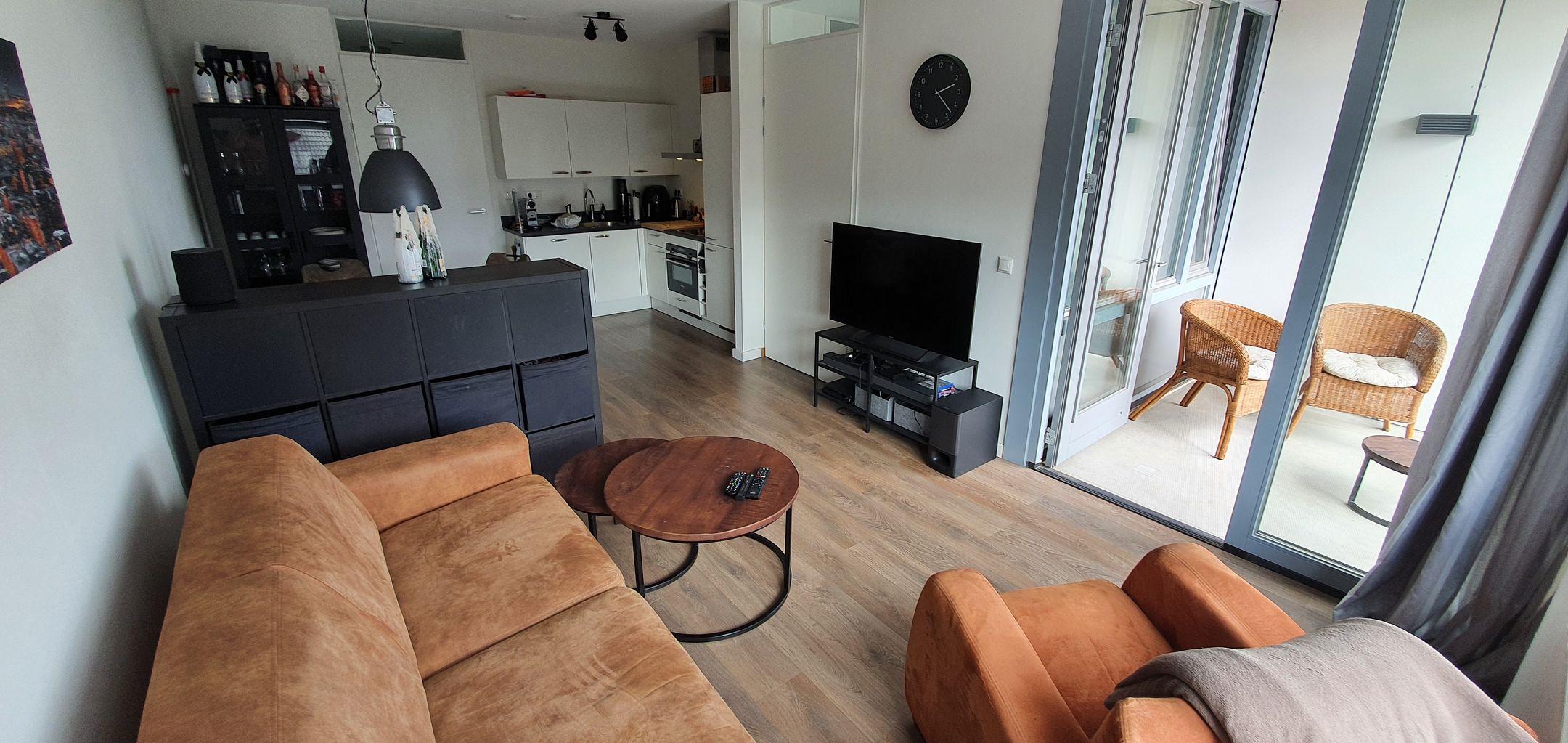 - Woonkamer met open keuken voorzien van diverse inbouwapparatuur waaronder koelkast, vriezer, vaatwasser, inductiekookplaat en afzuigkap;