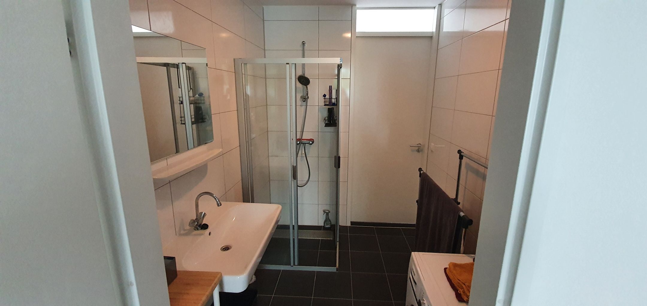 - (Deels) betegelde badkamer voorzien van inloopdouche met glazen douchewand en wastafel met spiegel;