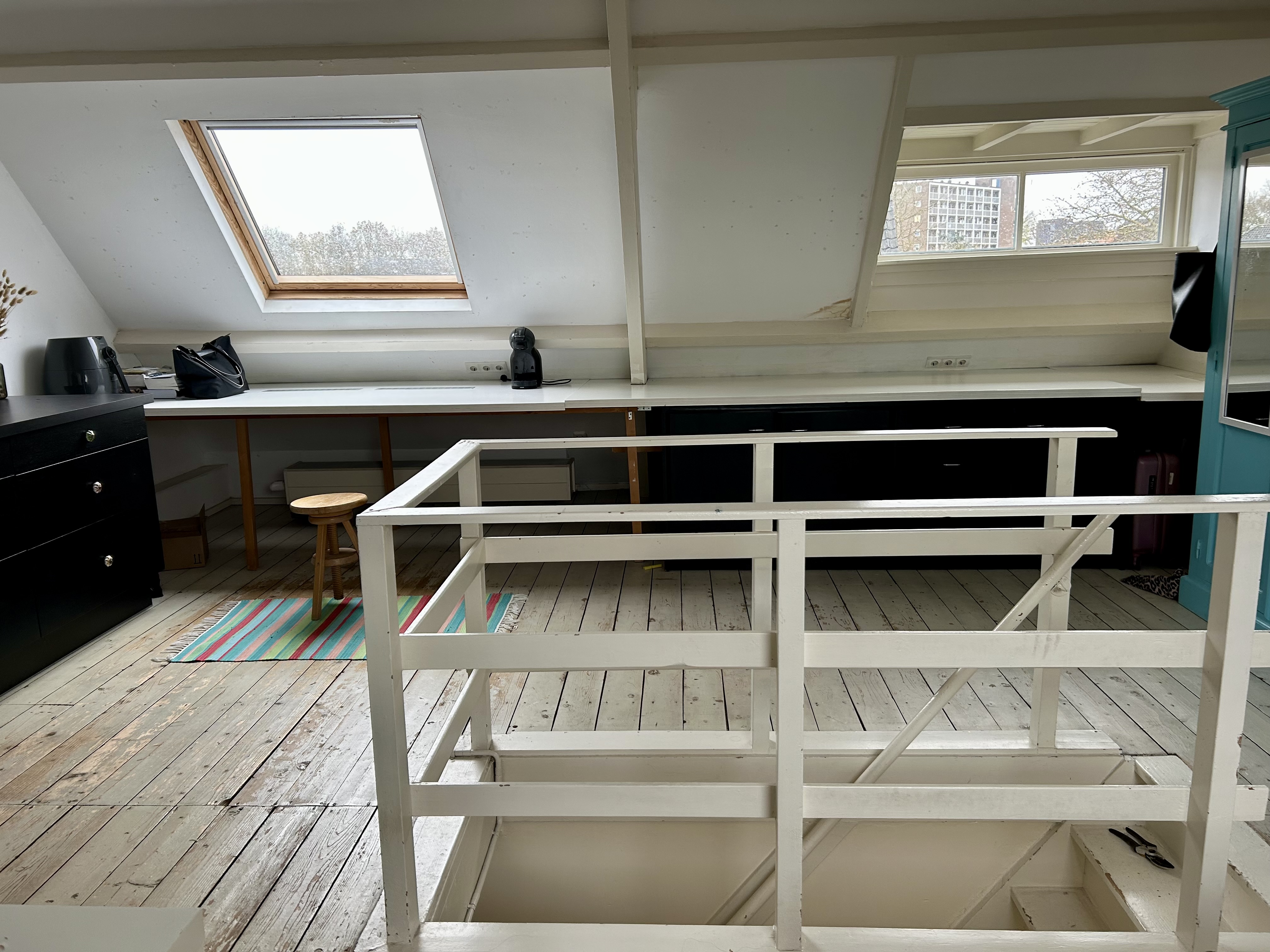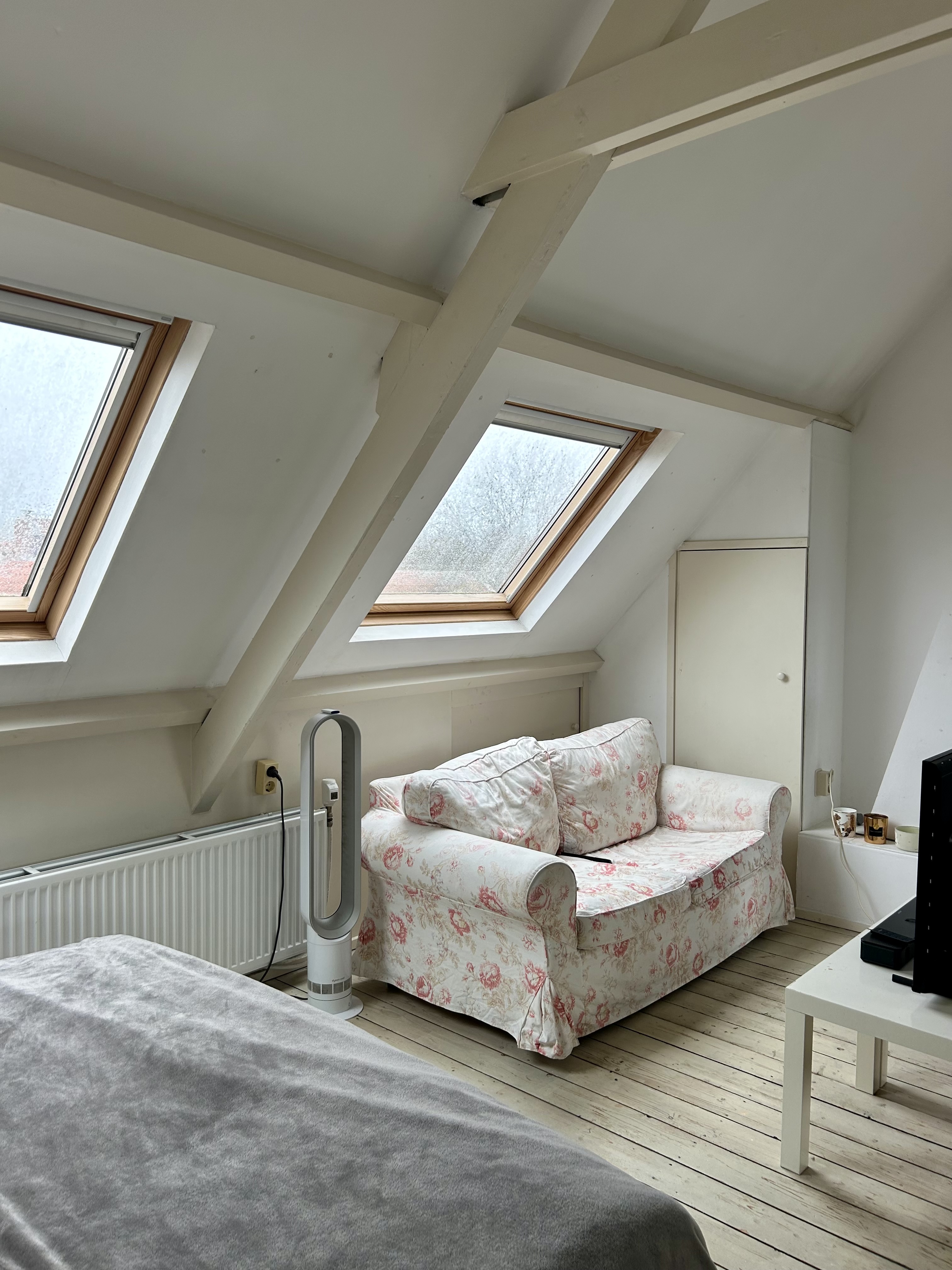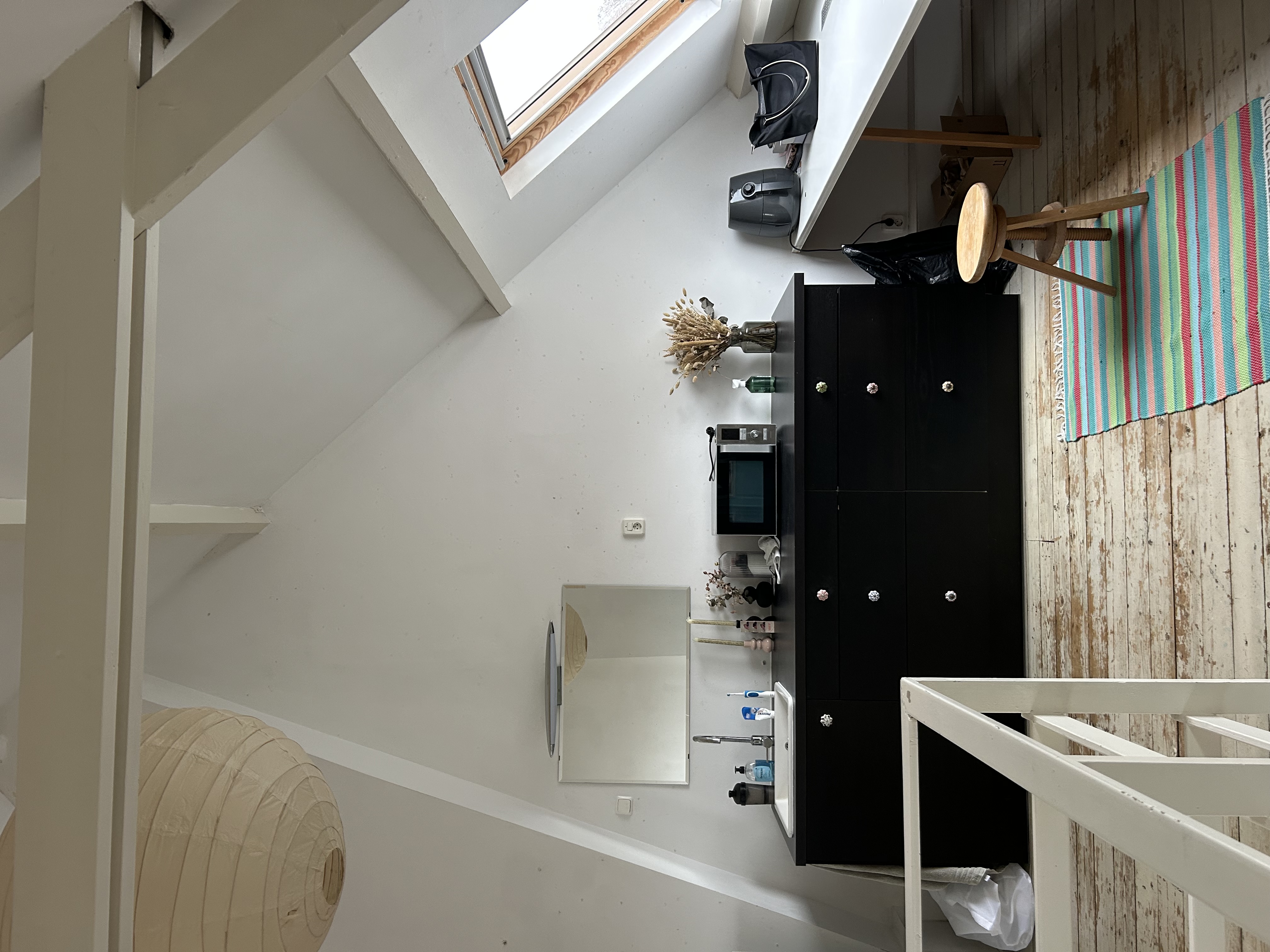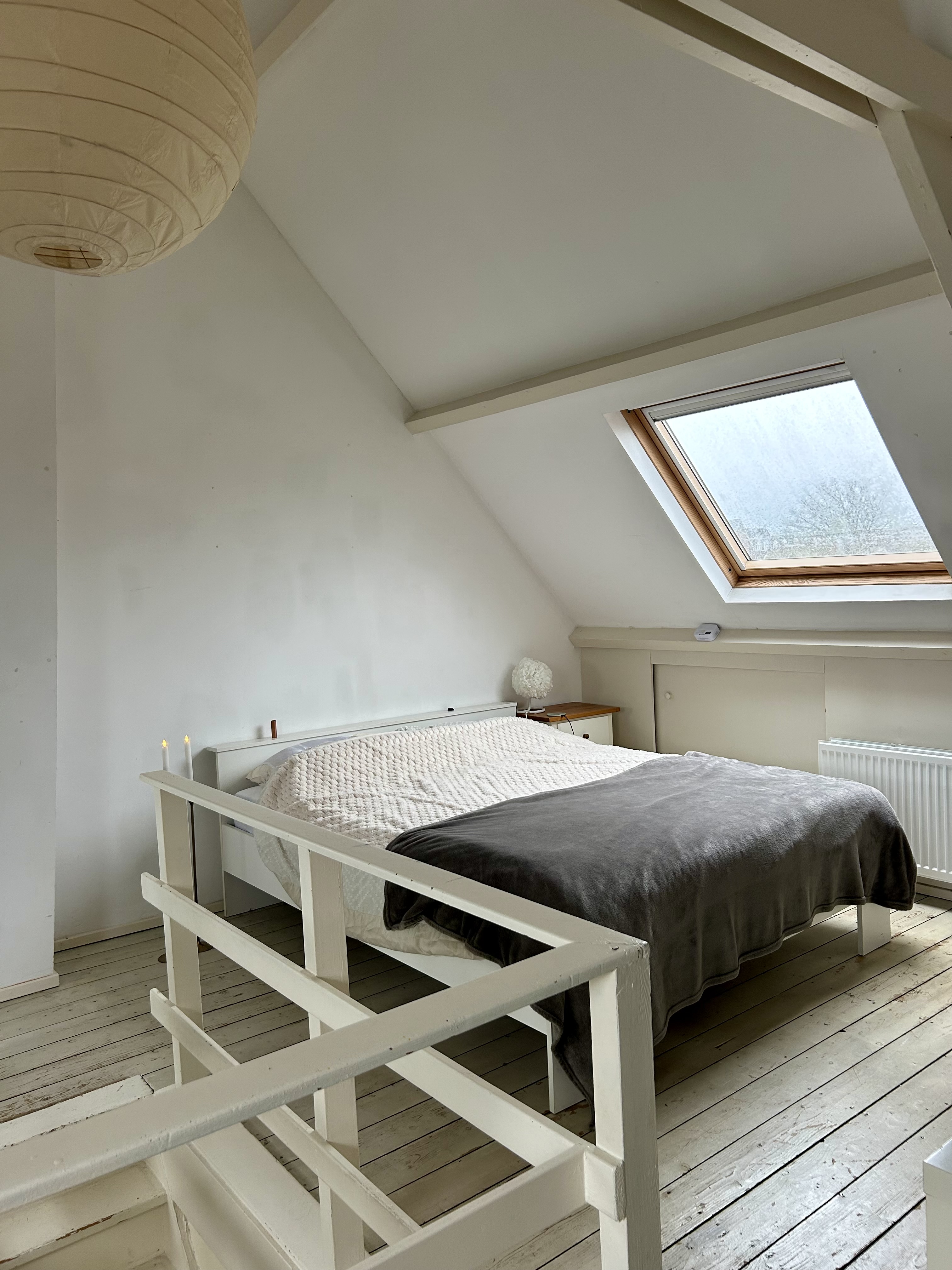 Je hebt één huisgenoot, met wie je voordeur, keuken, badkamer en wasmachine deelt. De kamer ligt op zolder en beslaat de hele oppervlakte van het huis, onder de 5 meter hoge nok van het dak, met aan beide zijden 2 ramen.