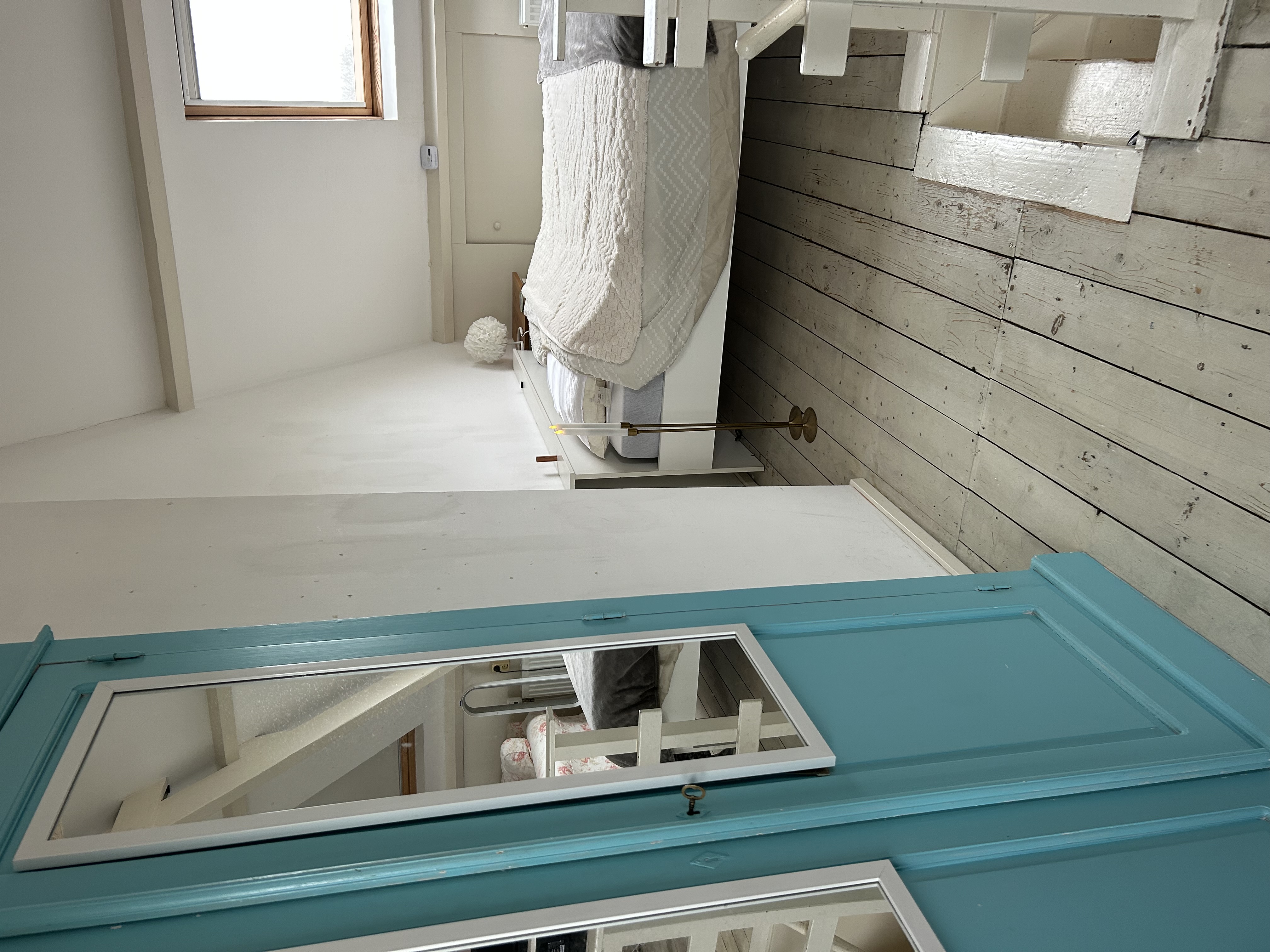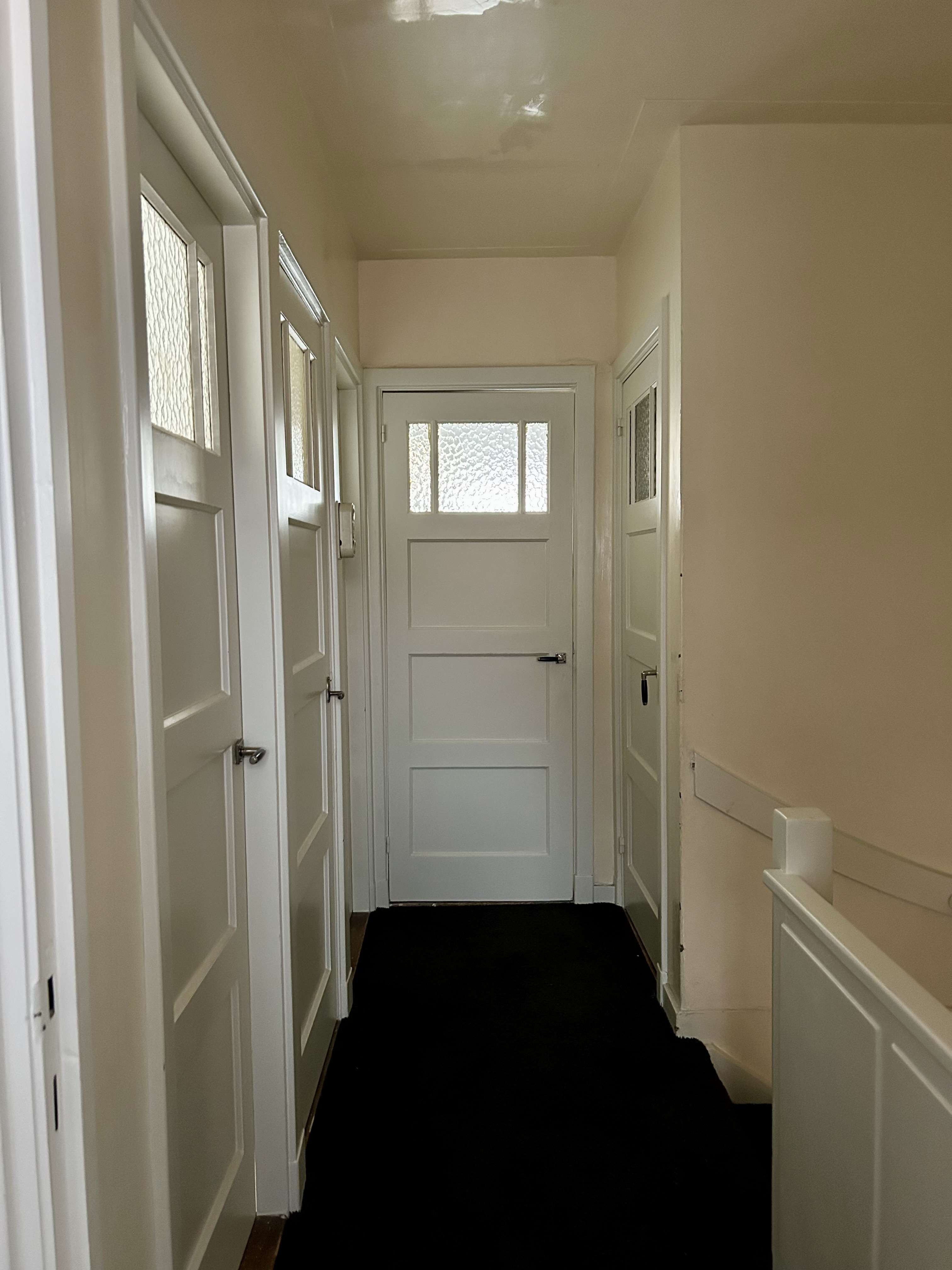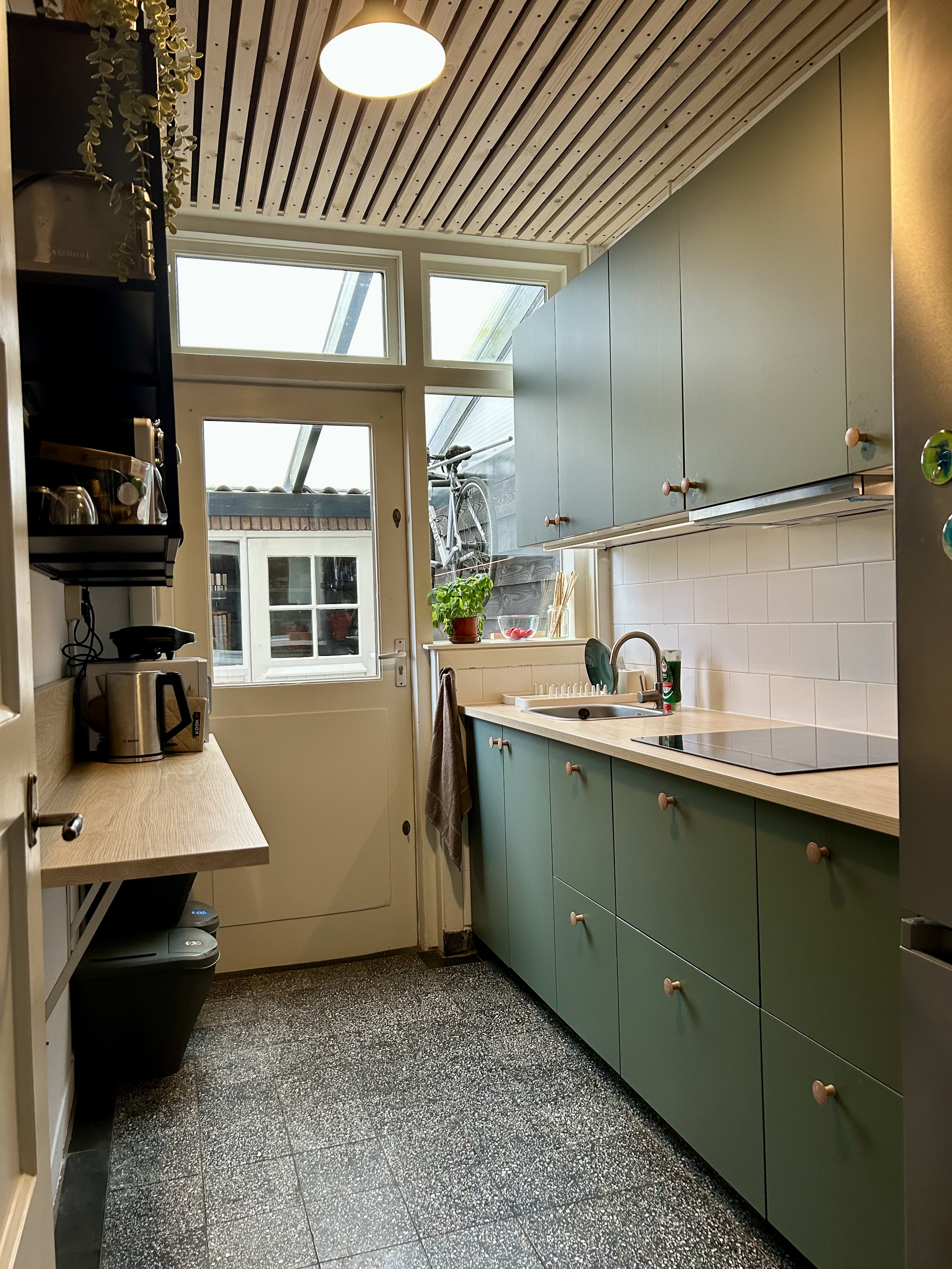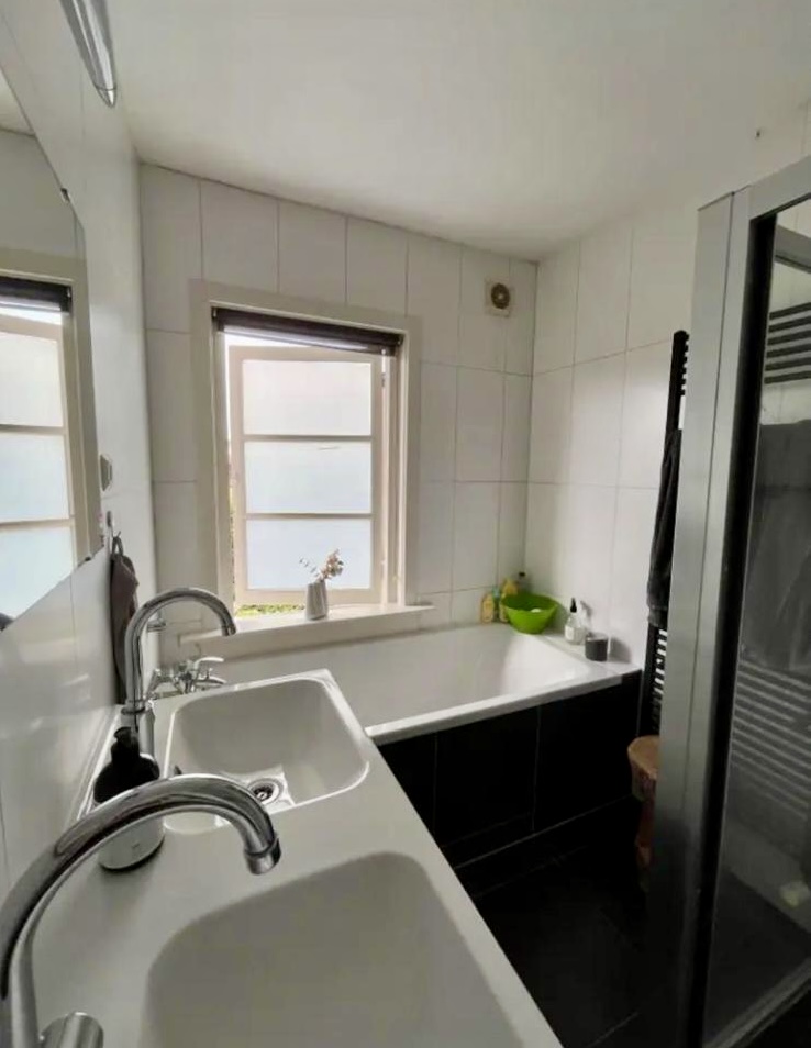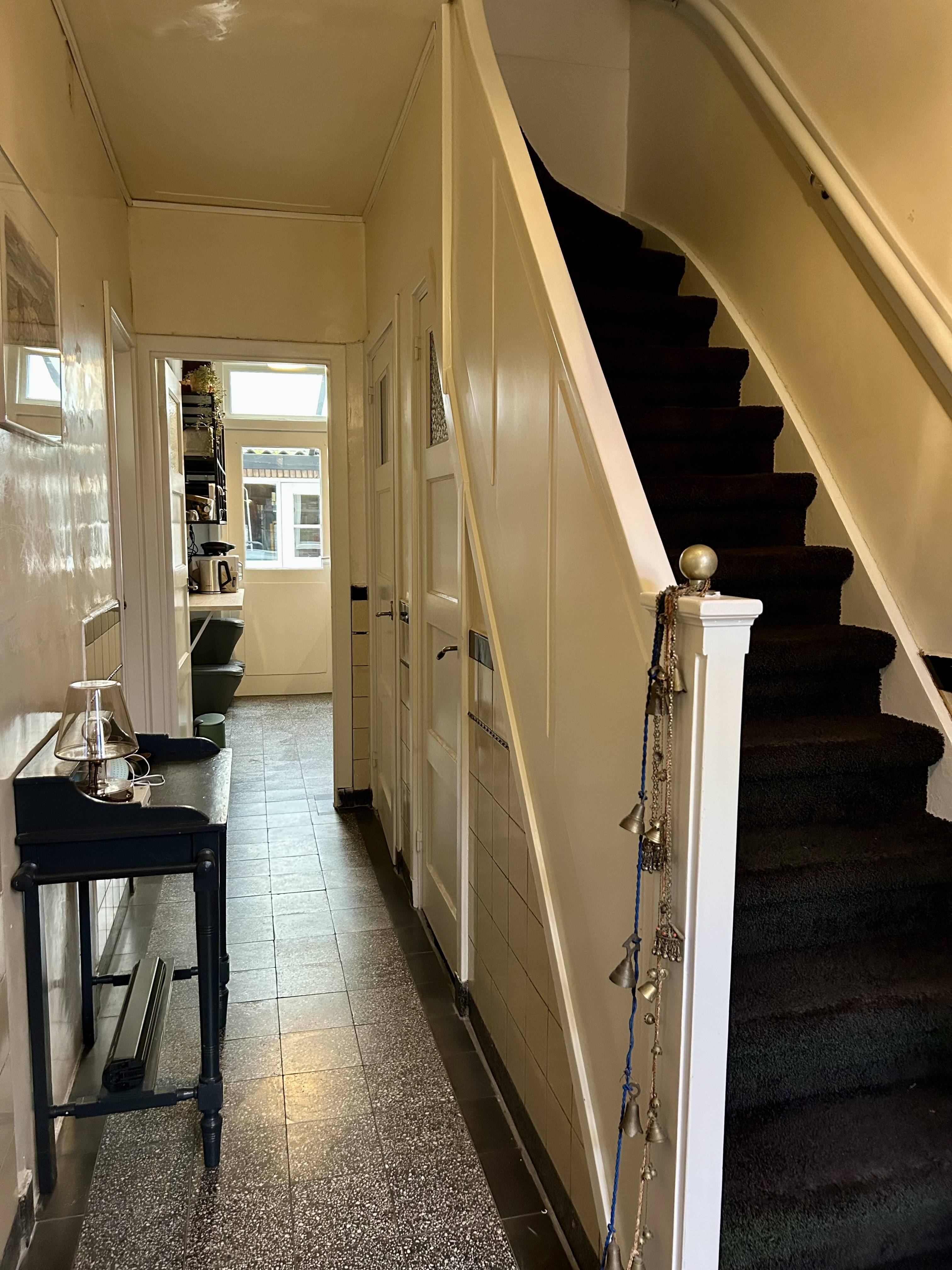 Je hebt één huisgenoot, met wie je voordeur, keuken, badkamer en wasmachine deelt. De kamer ligt op zolder en beslaat de hele oppervlakte van het huis, onder de 5 meter hoge nok van het dak, met aan beide zijden 2 ramen.