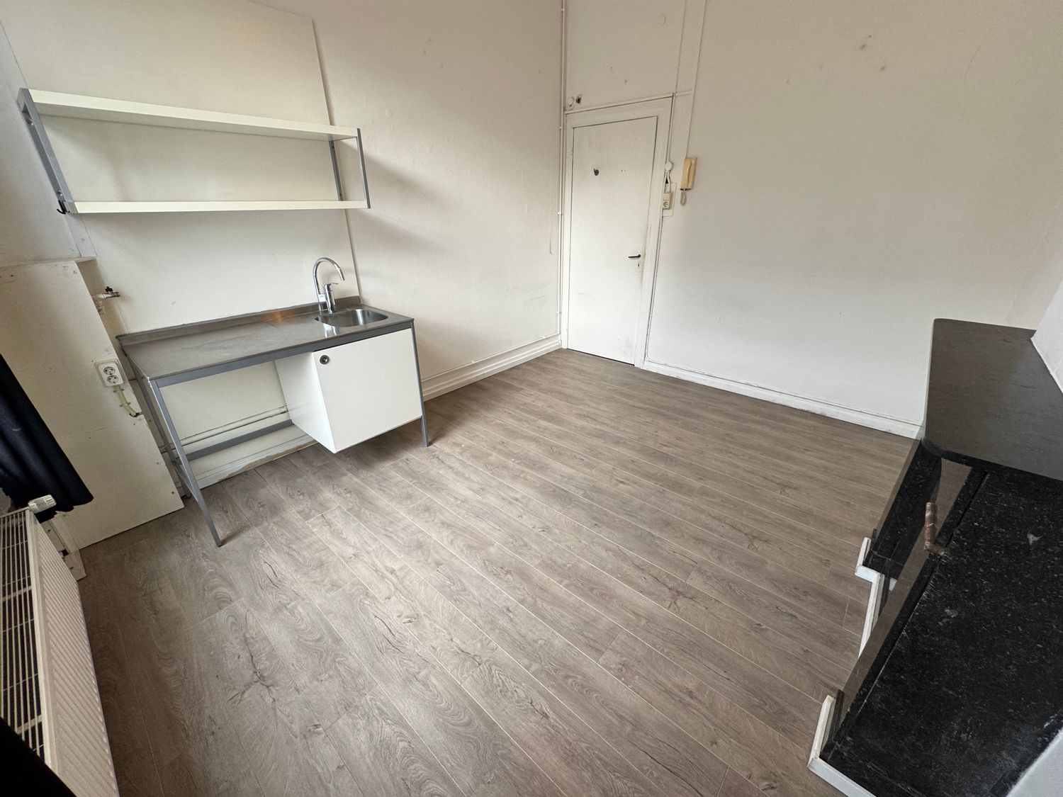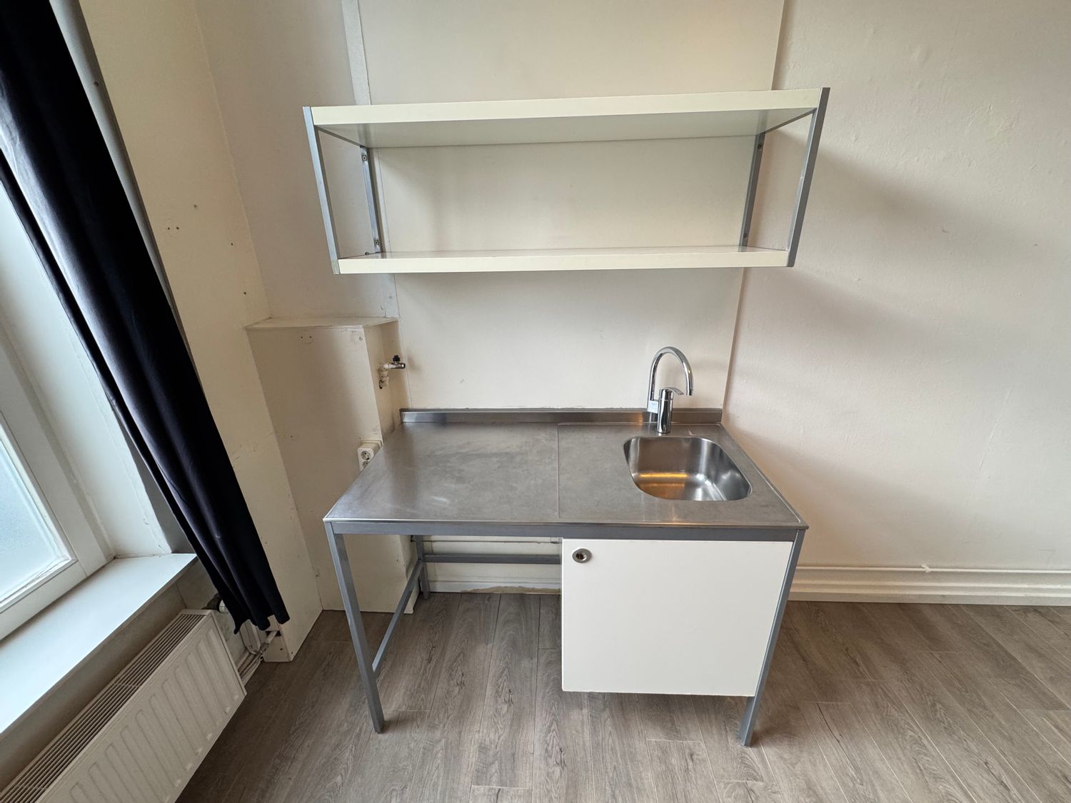 De kamer is gelegen op de begane grond aan de voorzijde van een goed onderhouden pand. De kamer (ca. 14m2) beschikt over een laminaatvloer, een eigen keukenblok en dubbel glas.