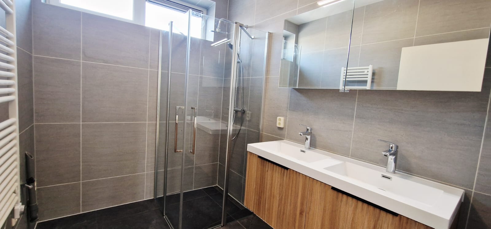 De badkamer is voorzien luxe douche, dubbele wastafel met wastafelmeubel en spiegelkast, handdoekradiator en er is plaats voor een wasmachine en droger opstelling.
