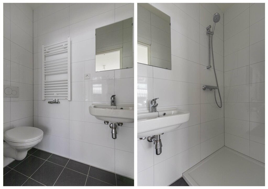 badkamer voorzien van douche, wastafel en hangend toilet;