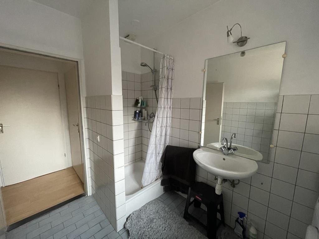 Badkamer circa 3,5 m2 met douche, wastafelmeubel, boiler en aansluiting voor wasmachine.