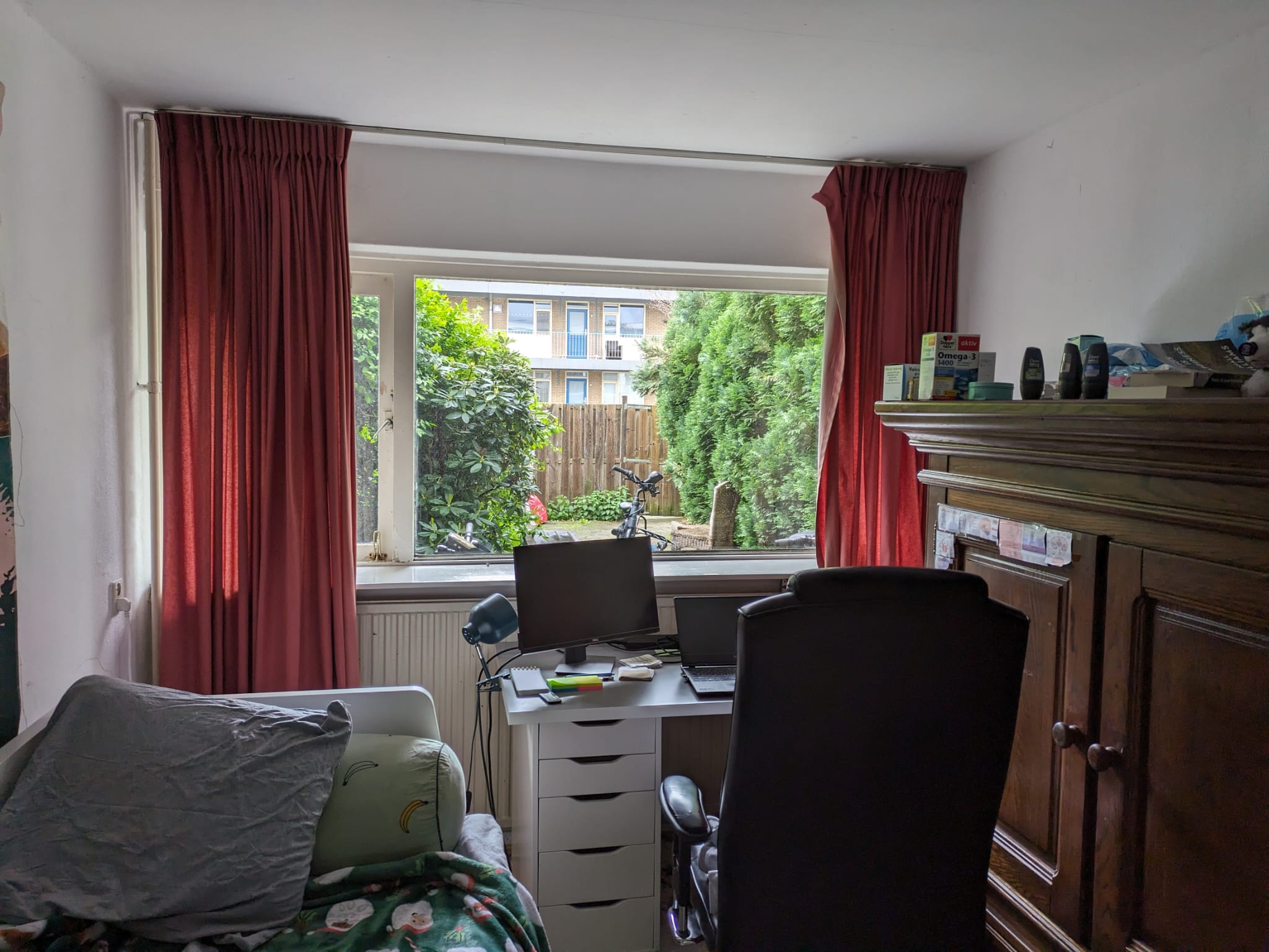 De kamer is gedeeltelijk gemeubileerd en dient voor € 200 (eenmalige kosten) te worden overgenomen. Zoals ook te zien op de foto's hieronder, bevindt de kamer zich op de begane grond en heeft een raam met uitzicht op de tuin. Het huis heeft in totaal 3 verdiepingen.