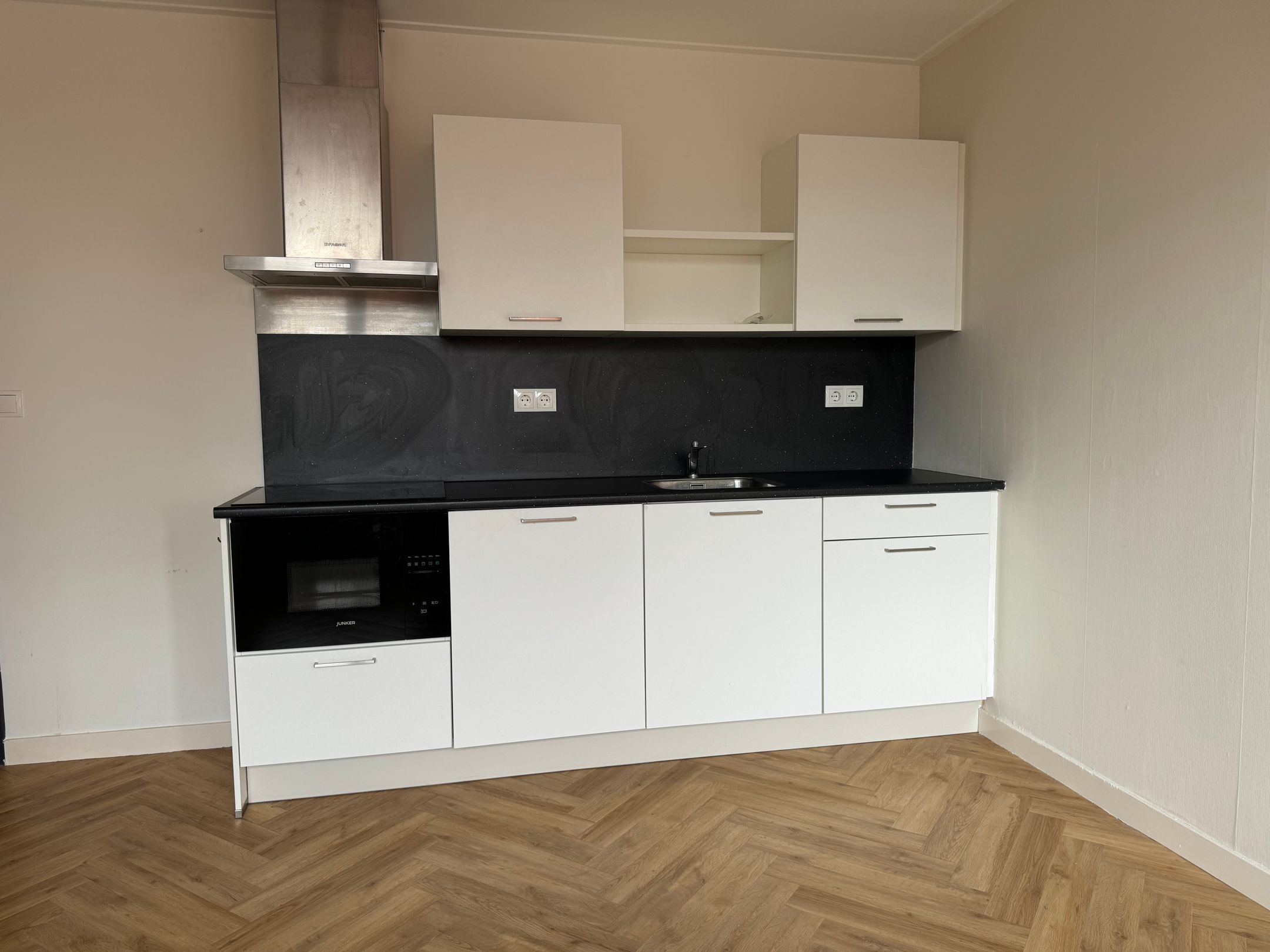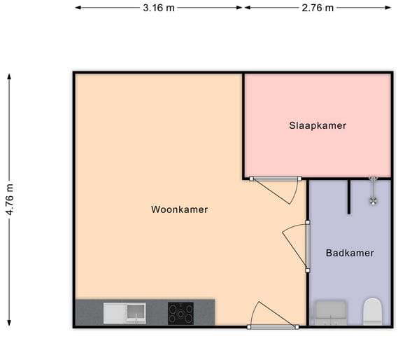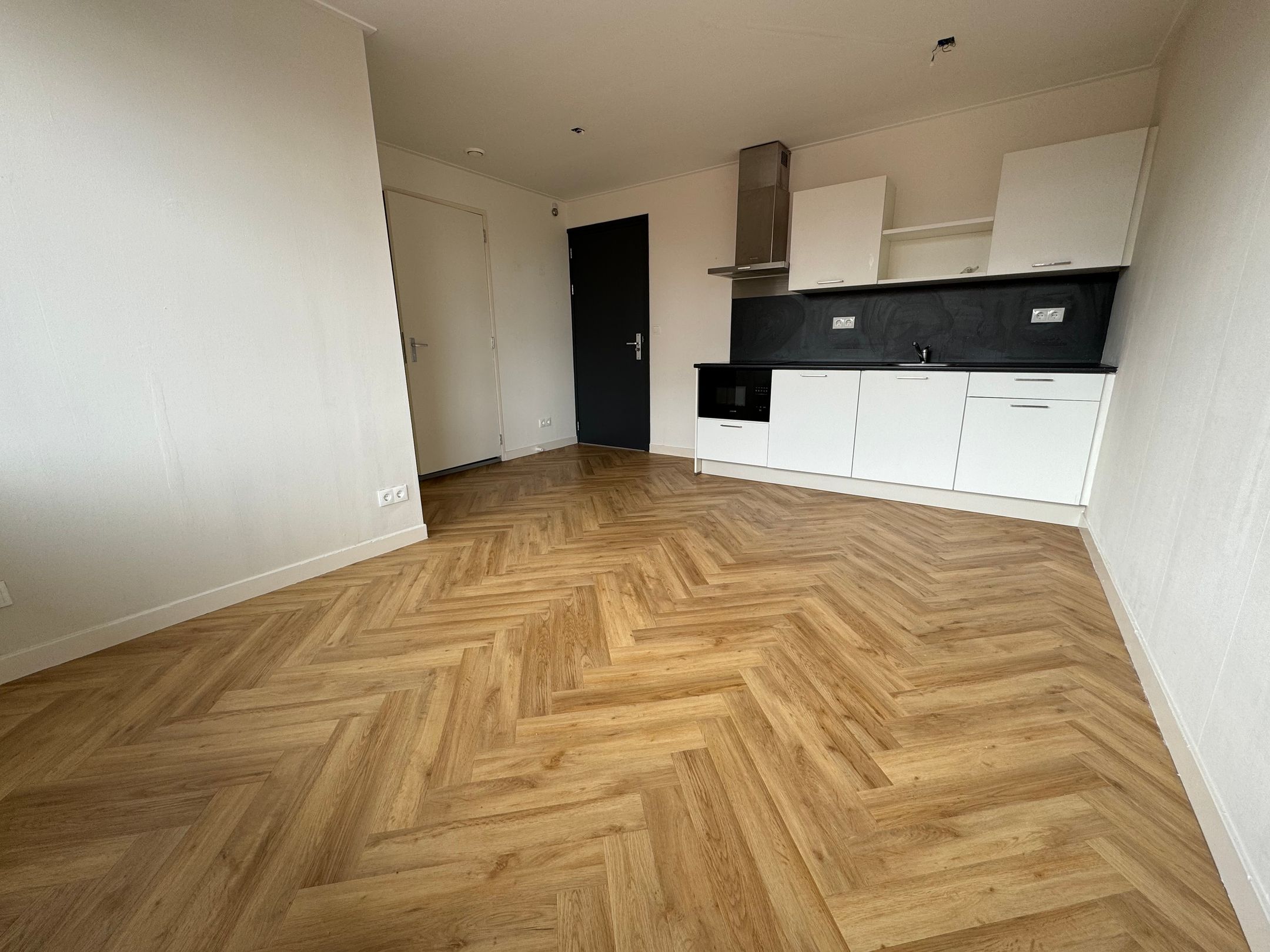 Indeling: entree, woonkamer met open keuken voorzien van koelkast, magnetron, kookplaat en afzuigkap, slaapkamer en badkamer met douche, toilet en wastafel.