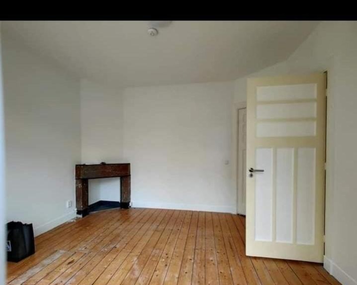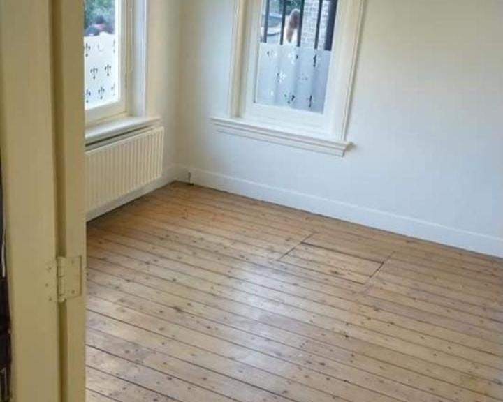 Dankzij de vele ramen is de ruimte bijzonder licht. De kamer beschikt over een authentieke houten vloer en een karakteristieke schouw in de hoek.