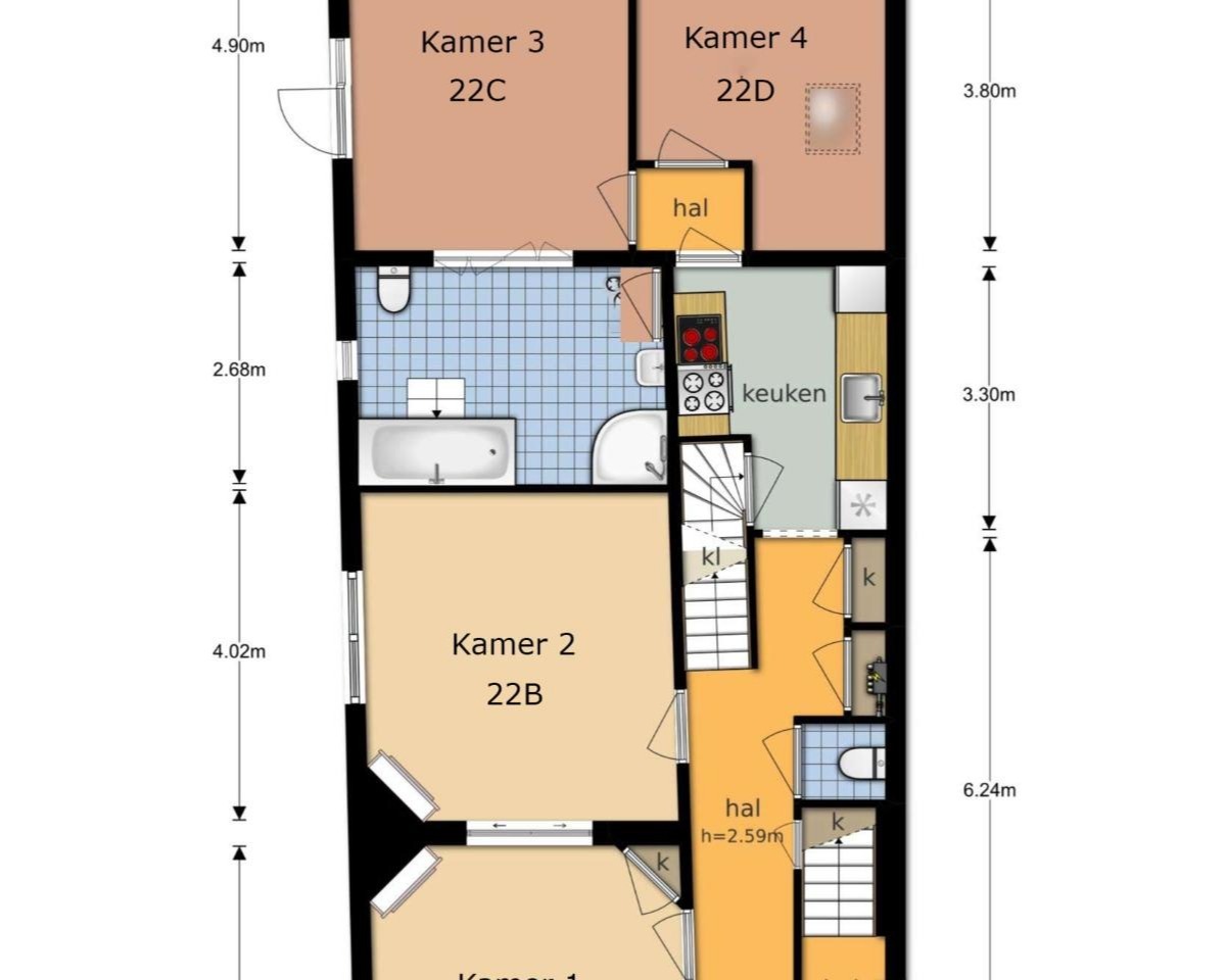 Verder is de kamer voorzien van een eigen thermostaat, waardoor de temperatuur naar wens kan worden ingesteld. Direct tegenover de kamer bevindt zich het toilet; links daarvan liggen de keuken en de toegang tot de badkamer en wasruimte.