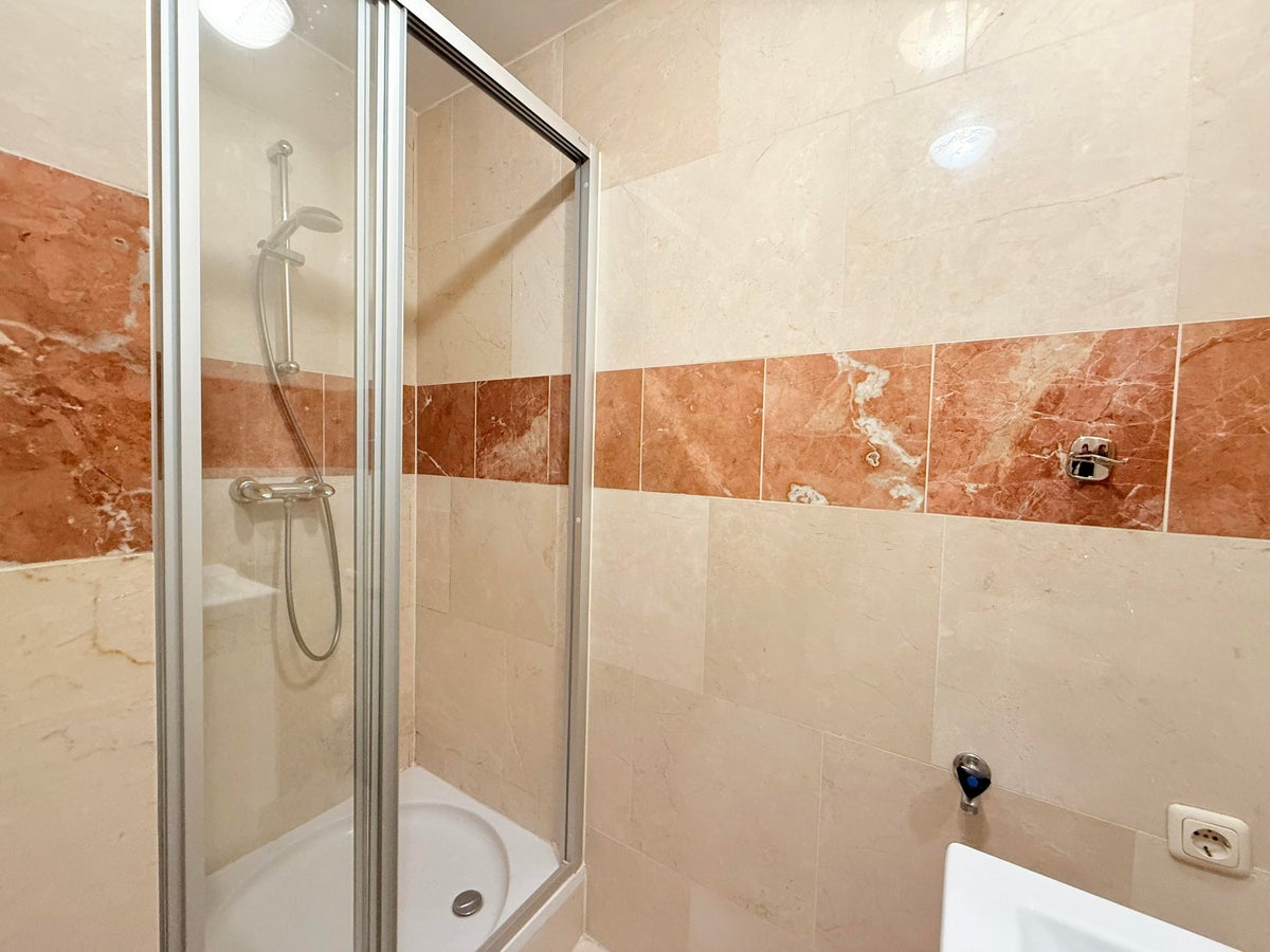 Via de woonkamer bereikt u de slaapkamer (ca. 2.60 x 2.10 m), gelegen aan de voorzijde van het appartement. Tevens geeft de woonkamer toegang tot de natuursteen betegelde badkamer (ca. 3 m²).