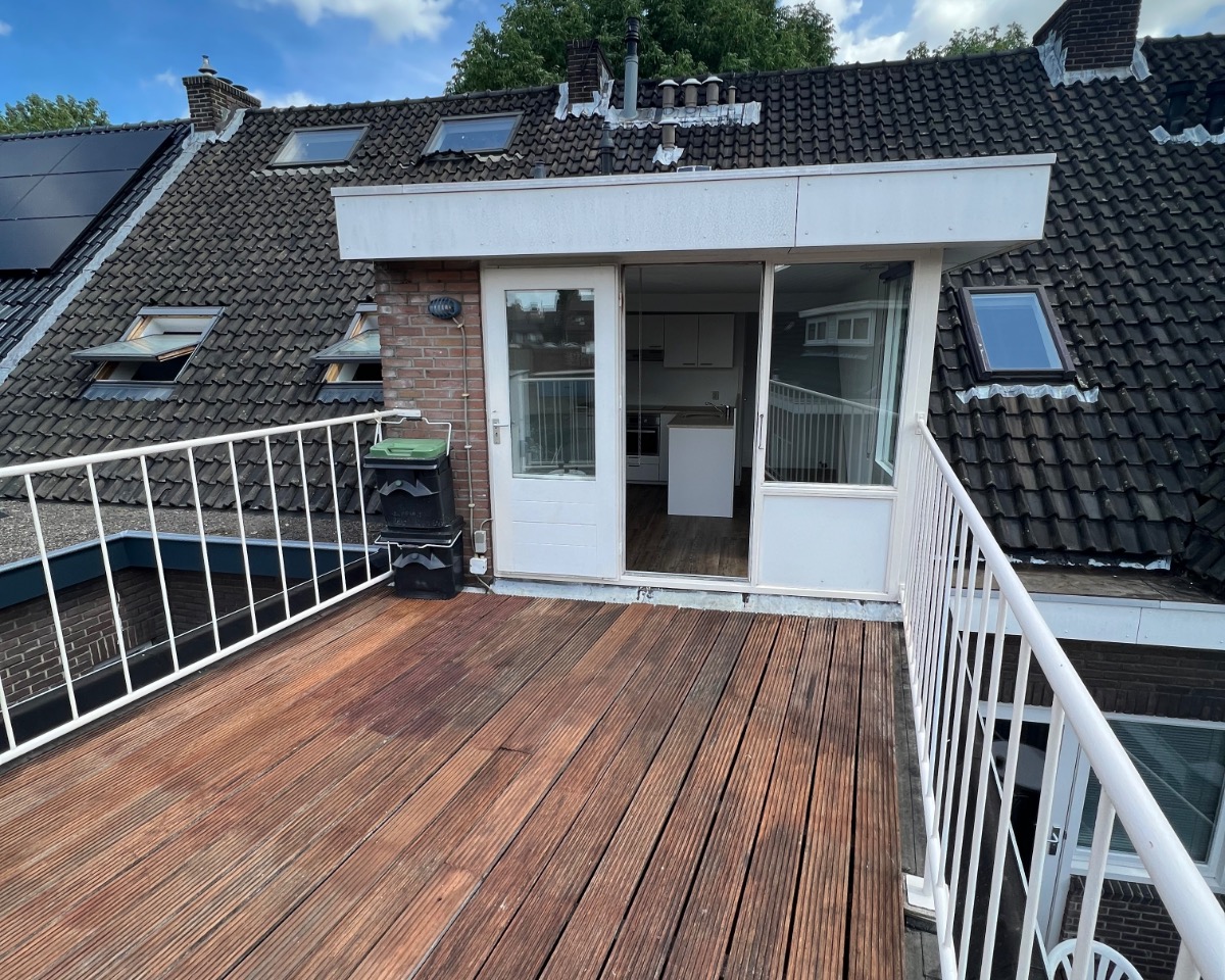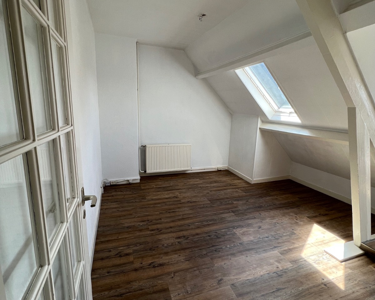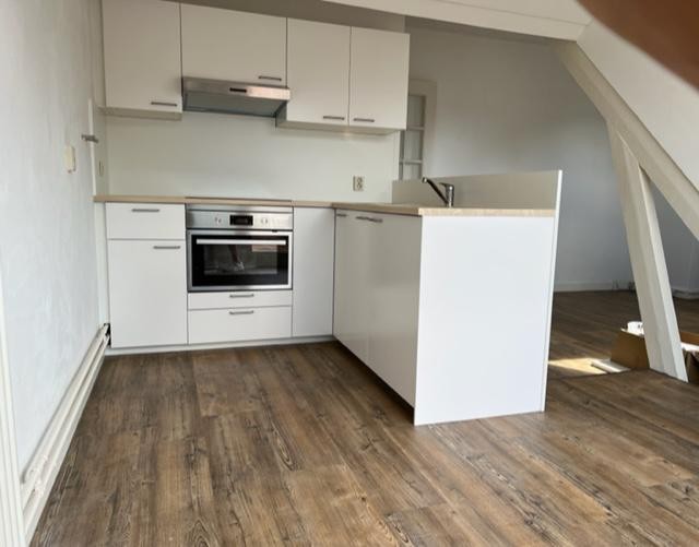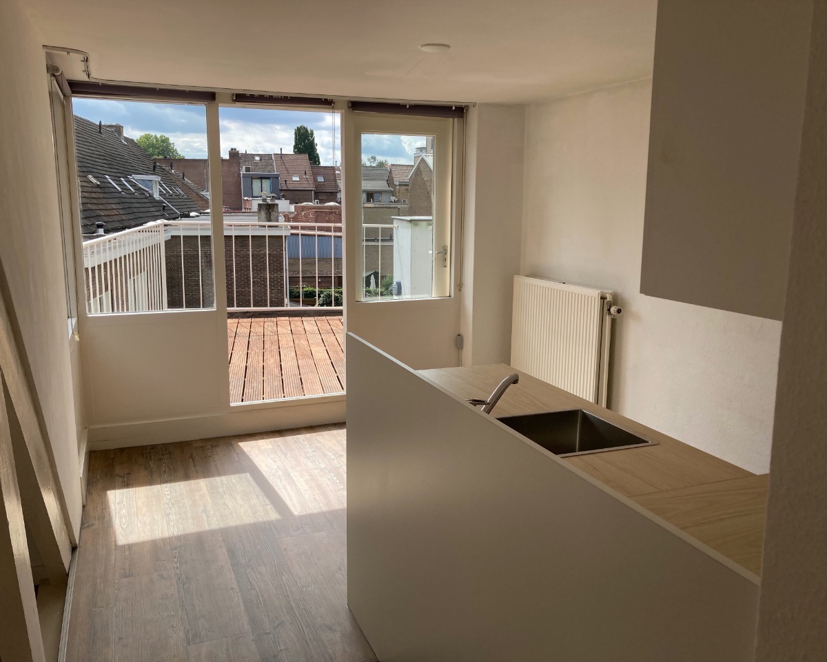 Appartement centrum Sittard , op 2e verdieping, 45 m2 met groot dakterras, woonkamer met open keuken, één slaapkamer, apart toilet, badkamer met douche, vaste wastafel en aansluiting voor wasmachine/droger.