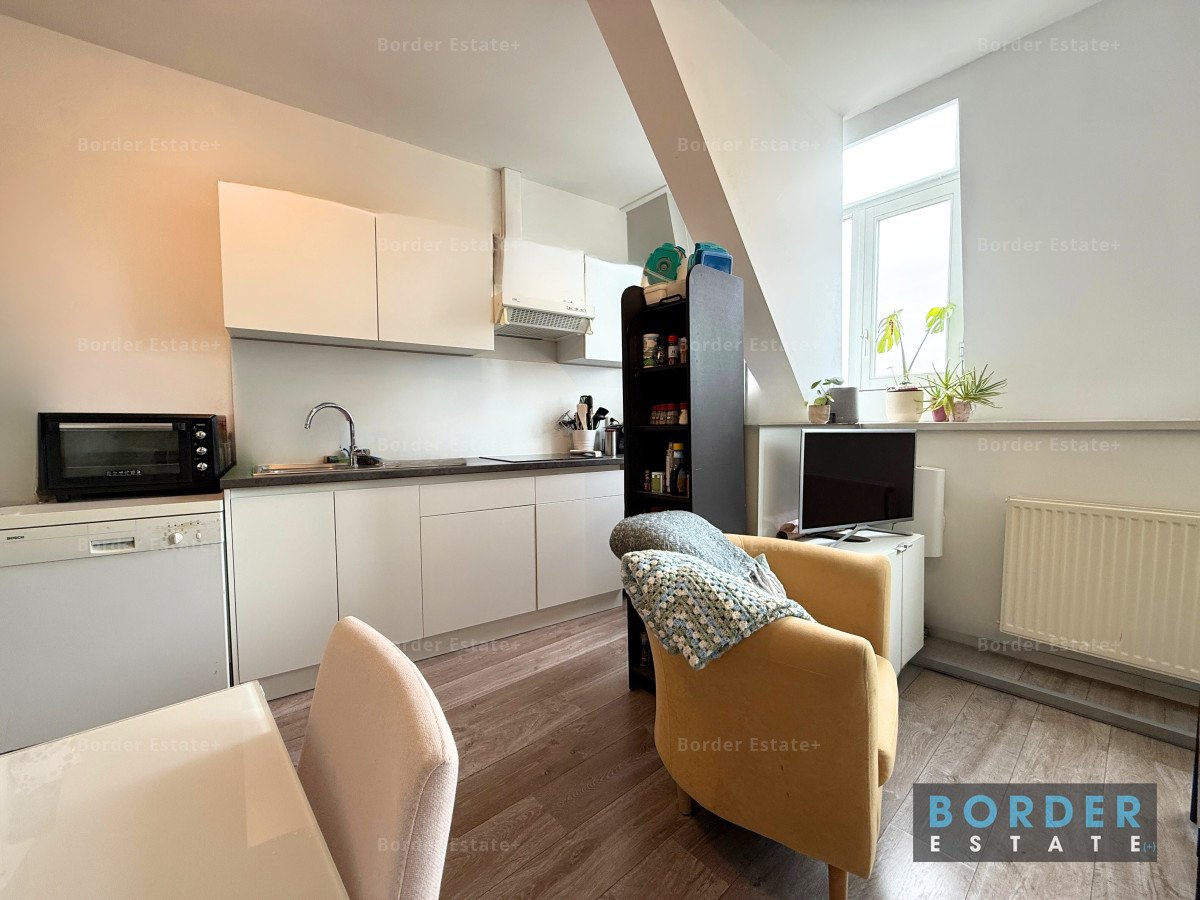De woning is gelegen op de bovenste etage en beschikt over een lichte woonkamer, moderne keuken, een nette badkamer met douche, en een apart toilet. De kamer ligt onder een sfeervolle schuine daklijn en biedt voldoende ruimte en opbergmogelijkheden.