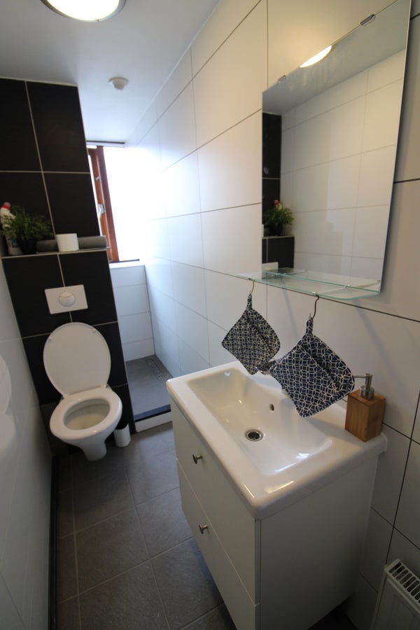 Fully tiled bathroom with a toilet, sink and shower. The rent excludes gas, water, electricity and internet subscription, an amount of €150.00 per month, and excludes municipal taxes. Minimum rental period: 12 months.