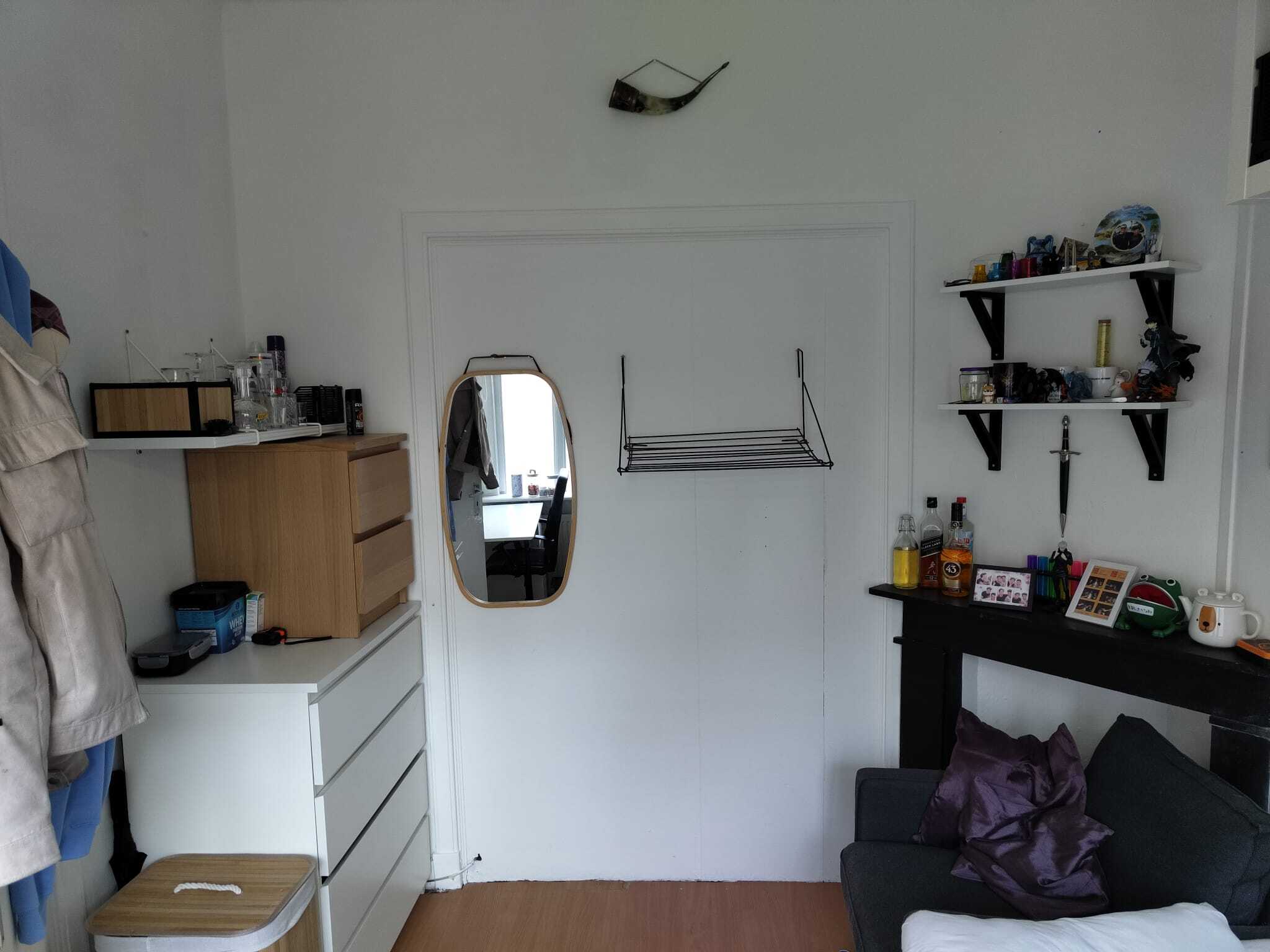 It is on the north side of the house keeping it relatively cool in summer, with a window film for privacy allowing natural light to enter the room. The room comes semi furnished (desk and cabinet).