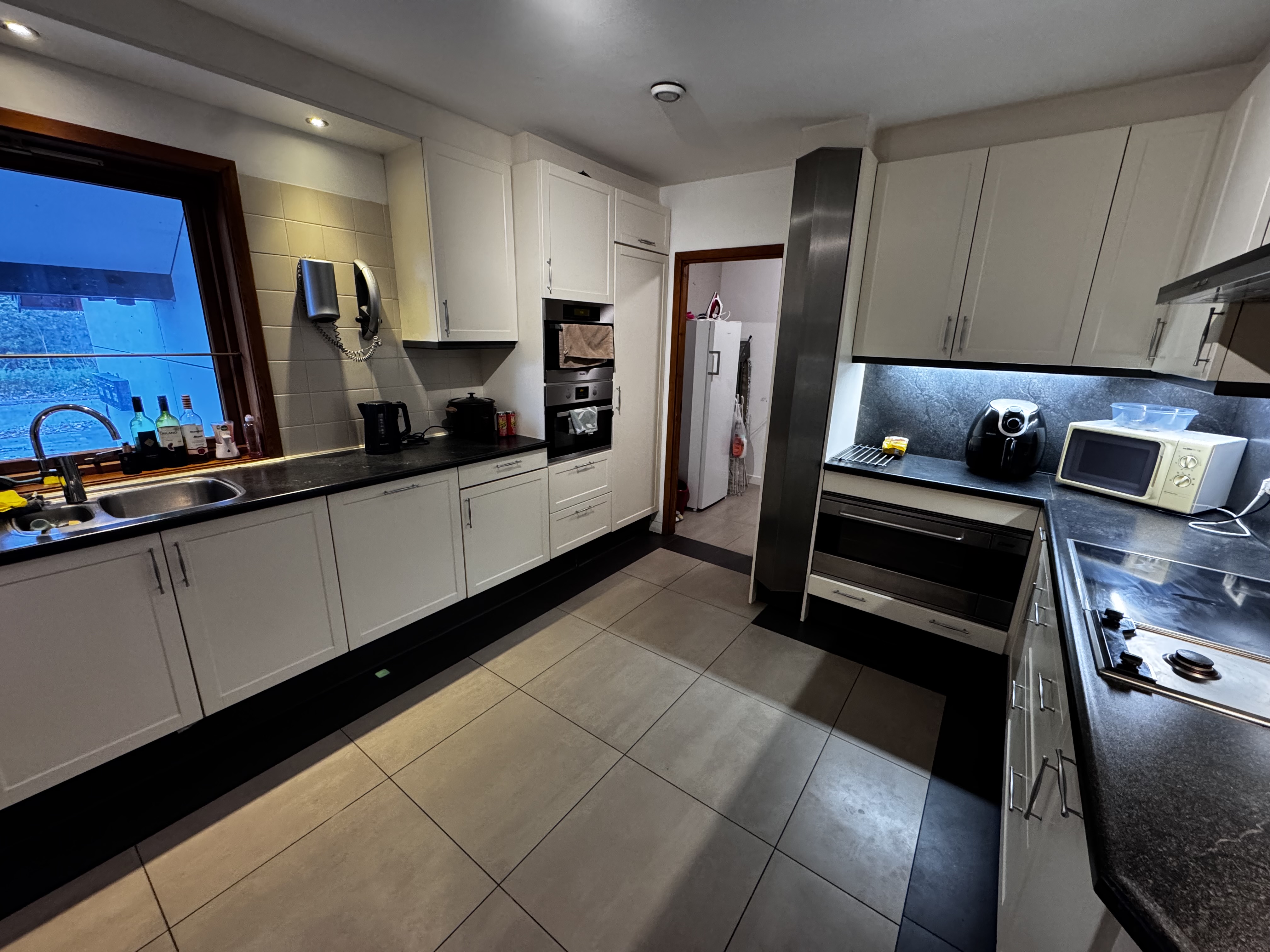 In de gemeenschappelijke keuken staat een grote koelkast, magnetron, vaatwasser en fornuis. Van alle gemakken voorzien.