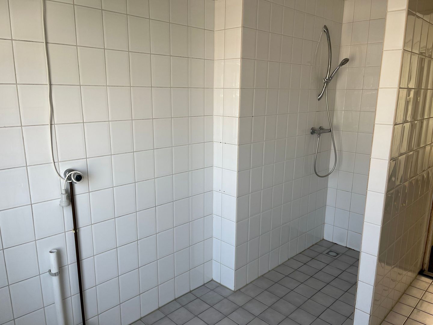 3,45 x 2,18m met vloertegels, vaste wastafel, inloopdouche en aansluiting wasmachine;