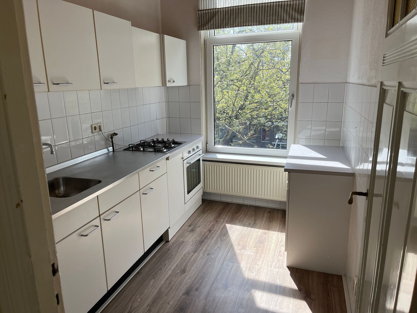 - Keuken ca. 3,24m x 2,16m voorzien van RVS aanrecht met diverse onder- en bovenkasten met inbouwkookplaat en wasemkap;