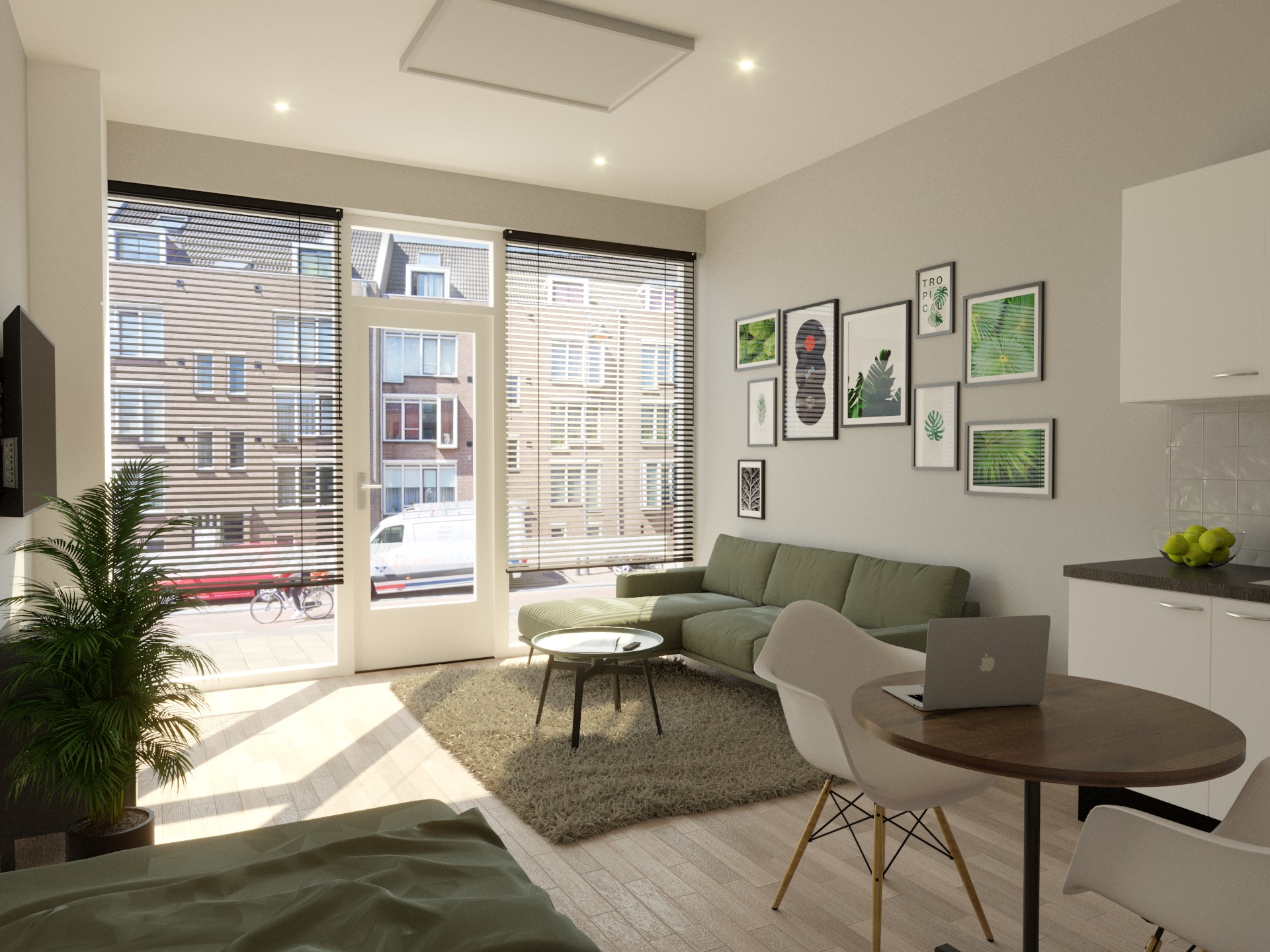De studio is geheel gasloos, er is een elektrische cv-ketel, je moet elektrisch koken. In de technische ruimte zit naast de elektrische cv-ketel ook een aansluiting voor een wasmachine. Op de woning zijn 3 zonnepanelen aangesloten, je betaalt een bijdrage per zonnepaneel via de huur. De opbrengst van de zonnepanelen wordt in mindering gebracht op het elektraverbruik. Op de hoek bevindt zich een bergingsblok met hierin je eigen berging.
