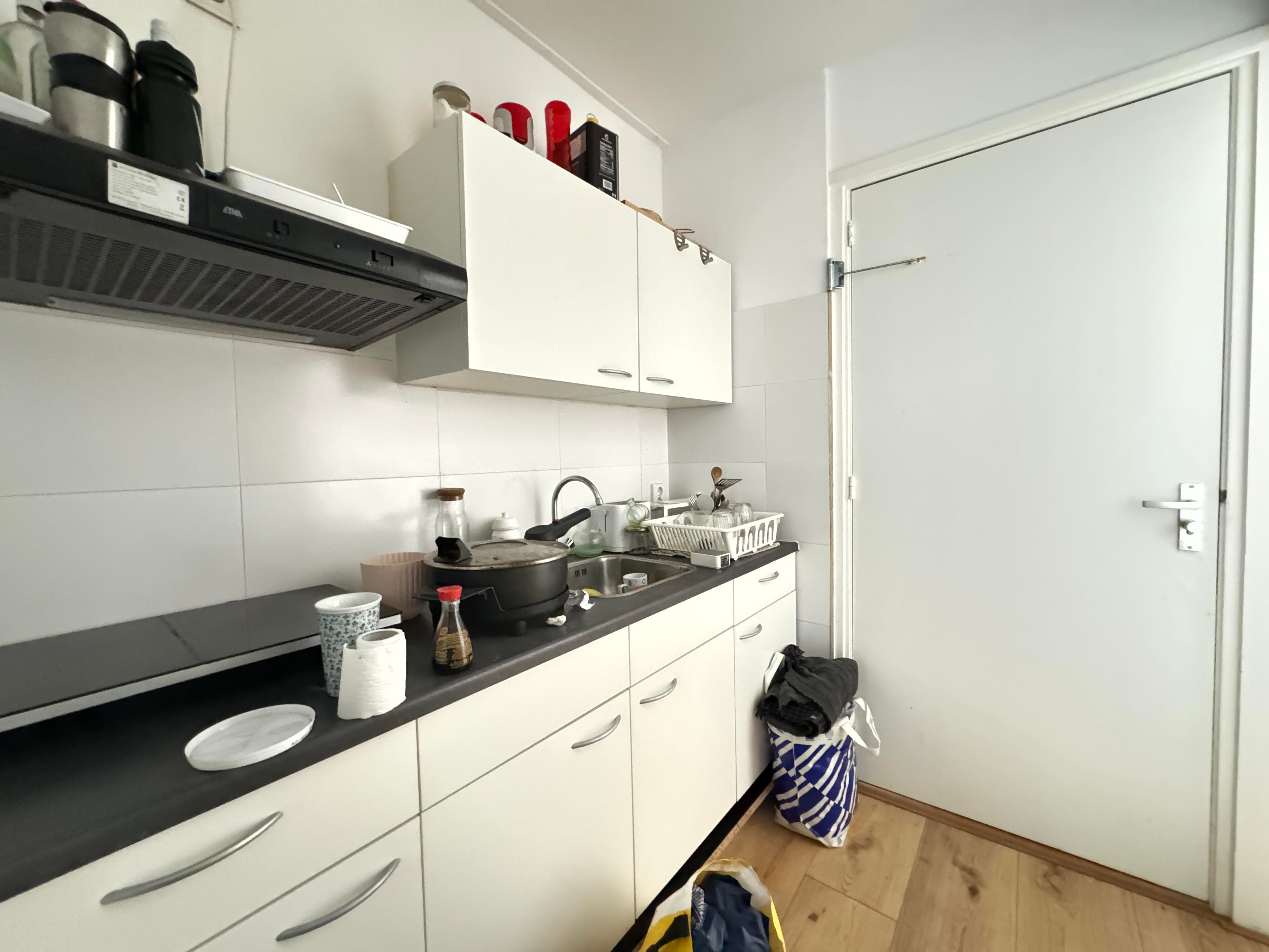 Bij binnenkomst betreed je direct de moderne, open keuken die naadloos overgaat in de lichte woonkamer. De keuken is volledig nieuw en uitgerust met hoogwaardige apparatuur zoals een koelkast, inductiekookplaat en afzuigkap. De woonkamer biedt een aangename, rechthoekige ruimte met hoge plafonds die zorgen voor een ruimtelijk gevoel. Dankzij de grote ramen is er volop natuurlijk licht en goede ventilatiemogelijkheden.
