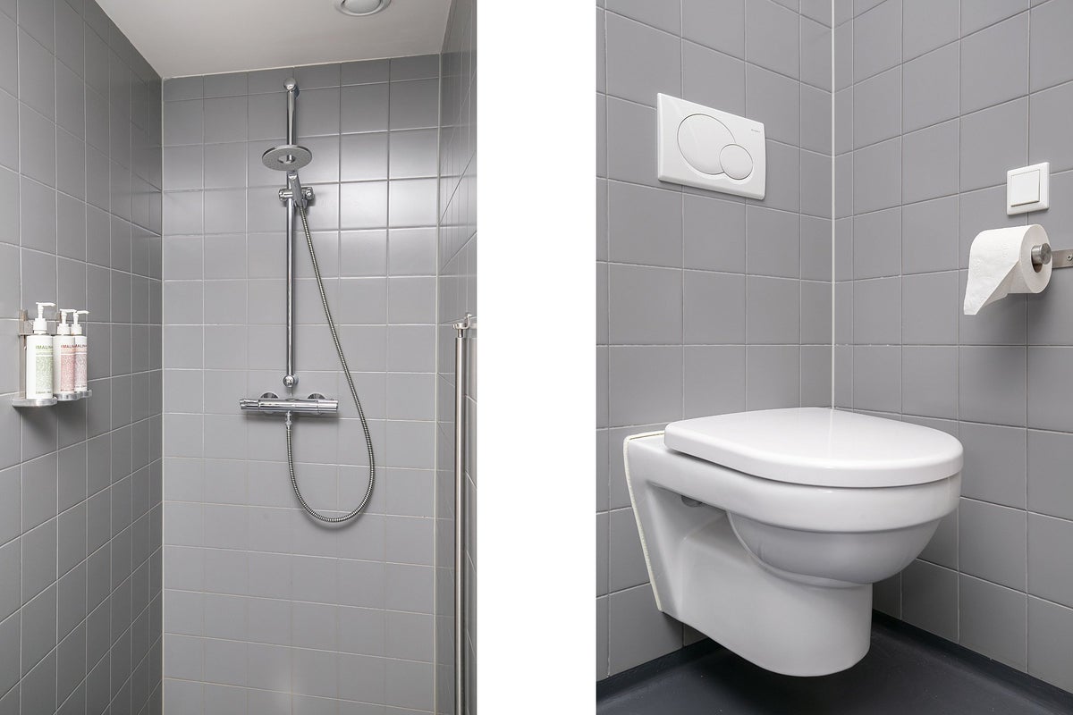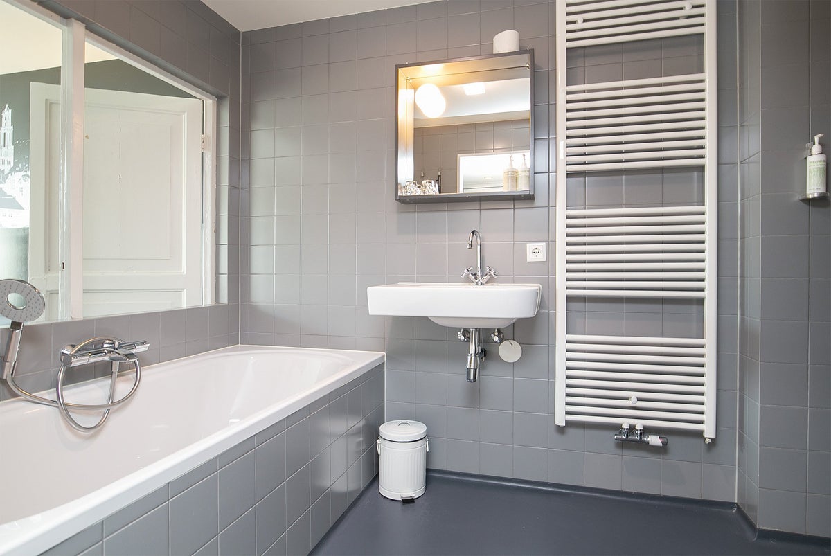 De badkamer is voorzien van bad, separate douche, zwevend toilet en wastafel met meubel.