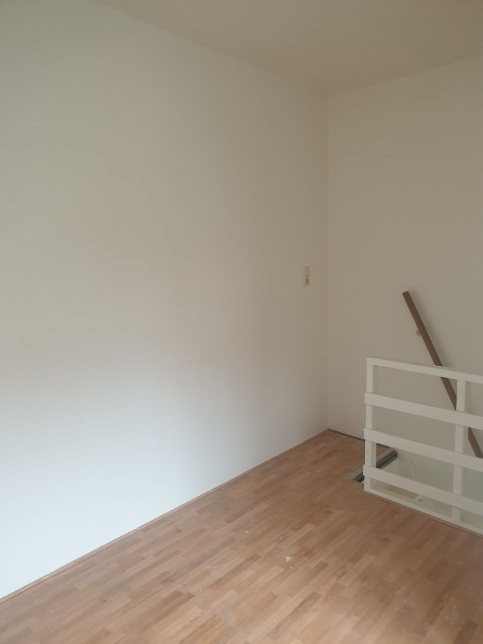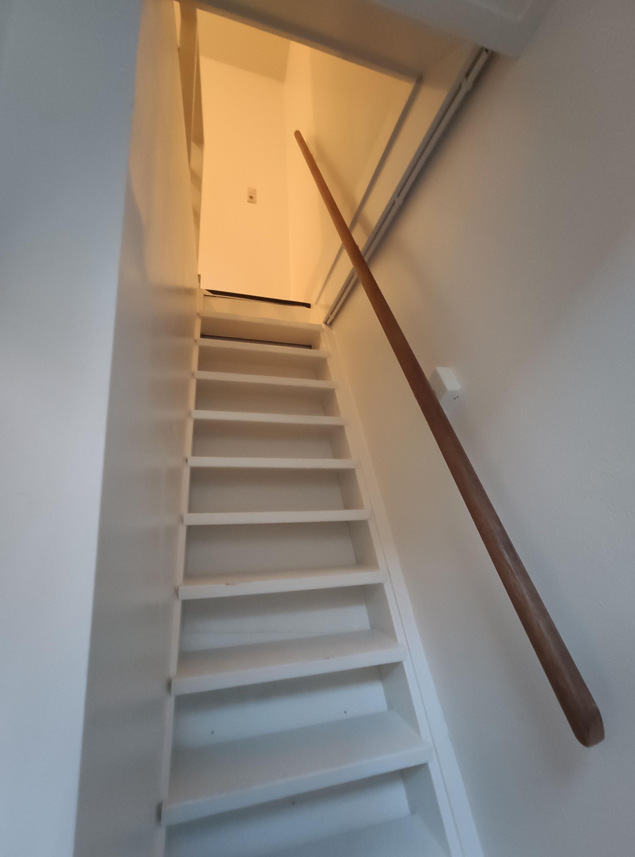 Via de trap komen we op de verdieping, waar je uitkomt in de slaapkamer met aangrenzend de badkamer.