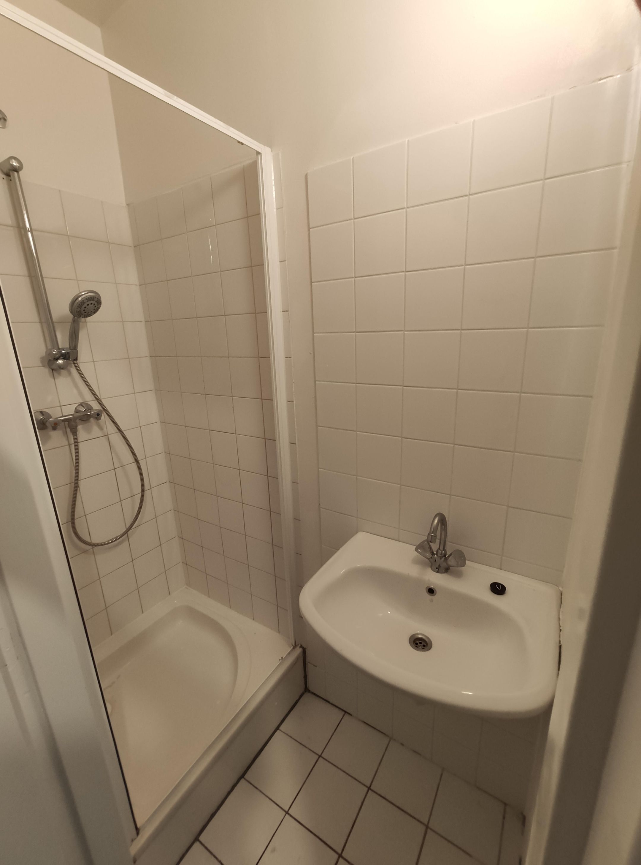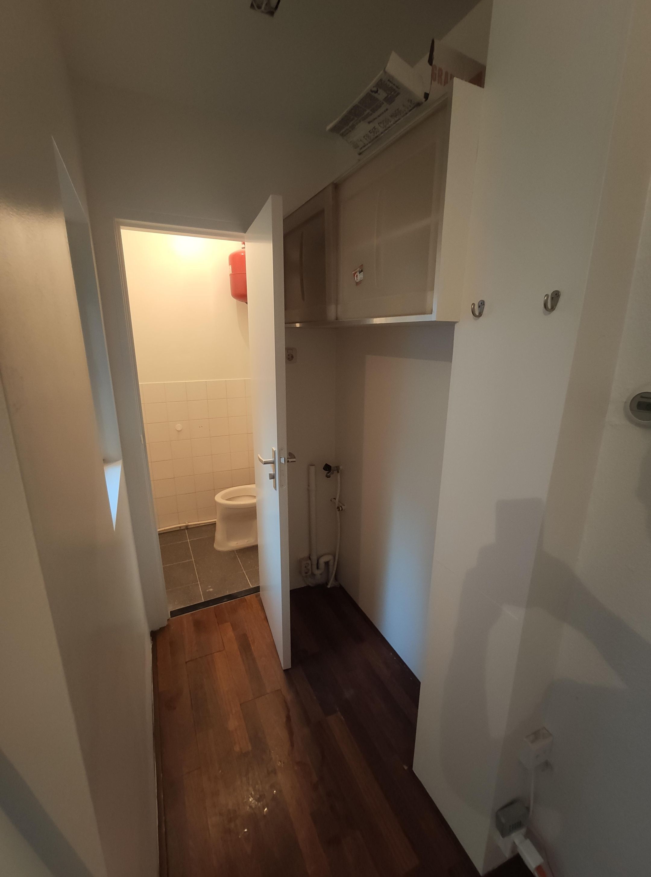 At the rear of the living room, on the left side, there is a hallway with a washing machine connection. Behind this area, you will find the toilet.