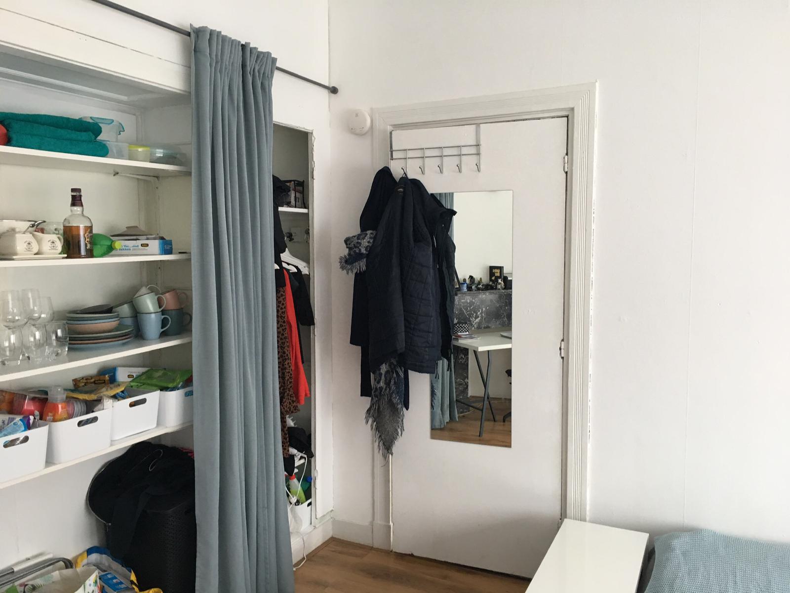 De kamer is gelegen op de eerste etage, aan de voorzijde van de woning. De kamer is 16m2 groot en beschikt over een handige, ruimtebesparende inbouwkasten. De kamer is eenvoudig in te delen in een 'woon- en slaapgedeelte'; beschikt over veel lichtinval door de grote ramen.